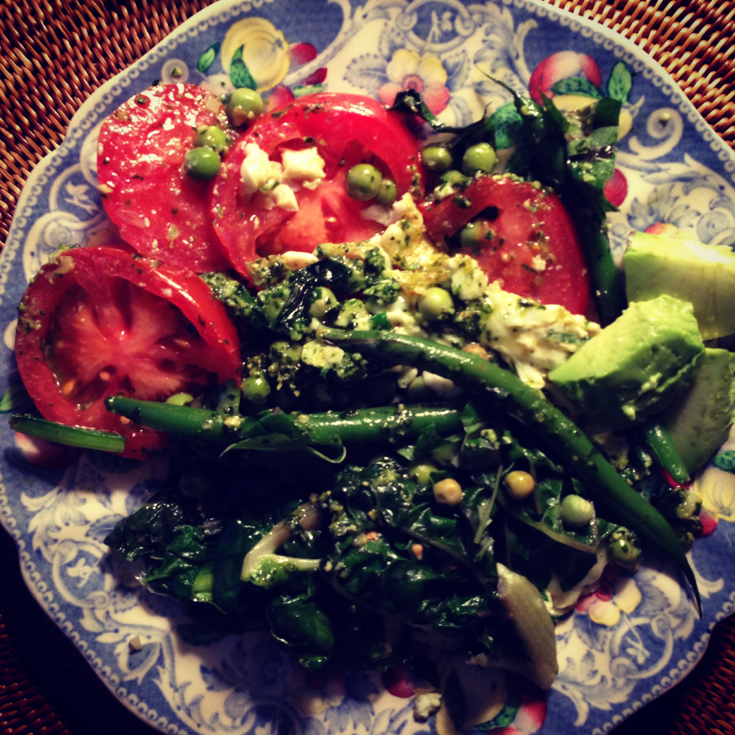 Another scramelette. This time with spinach, tomatoes, spring peas, haricot vert, and a few chunks of avocado for good measure.