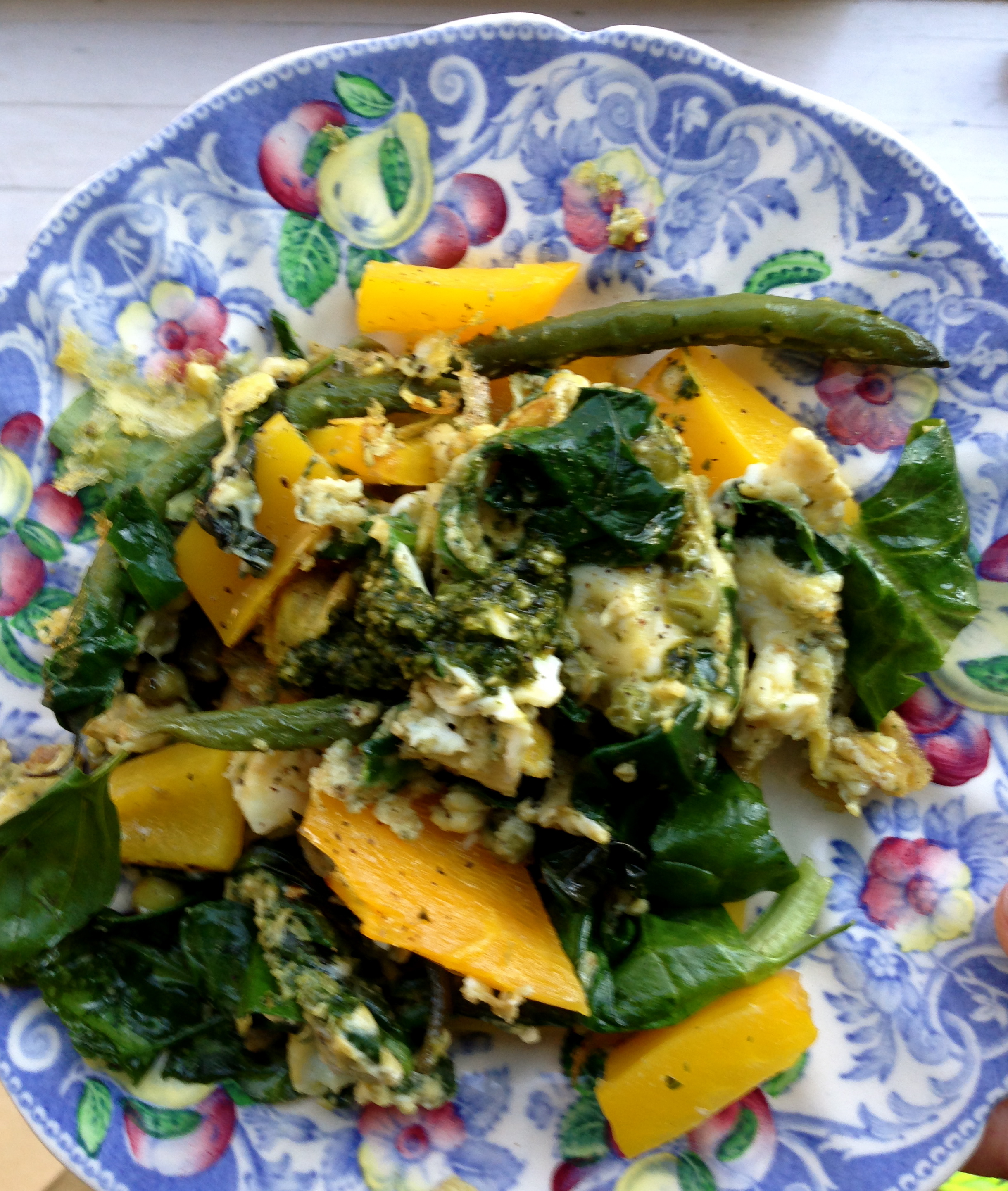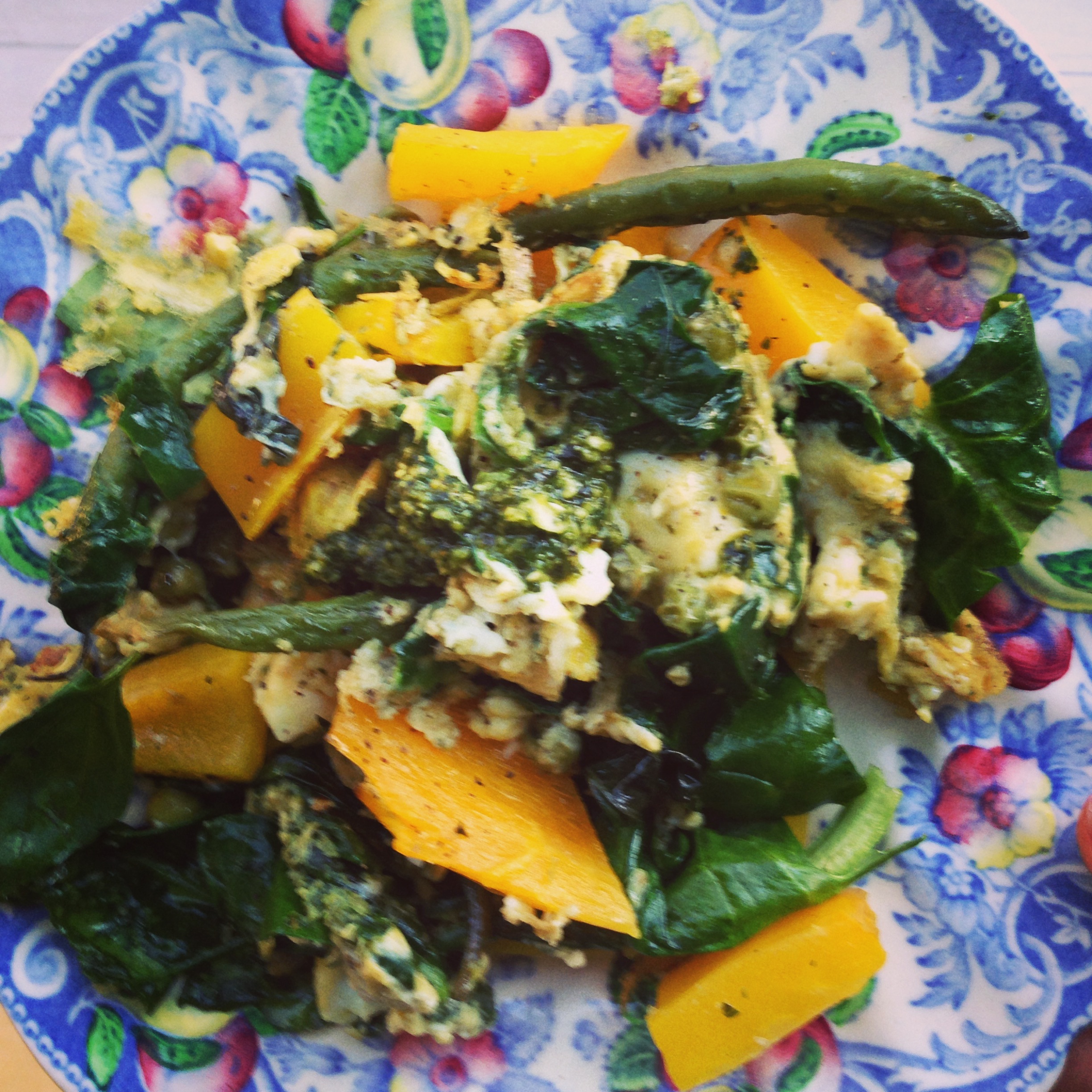 Green eggs and yellow vegetables..Pesto makes for an inventive addition to omelettes and scrambles. Here, I added a spoonful or two to an egg white scramelette (omelette meets scrambled) with yellow bell pepper, string beans, basil, and spinach.