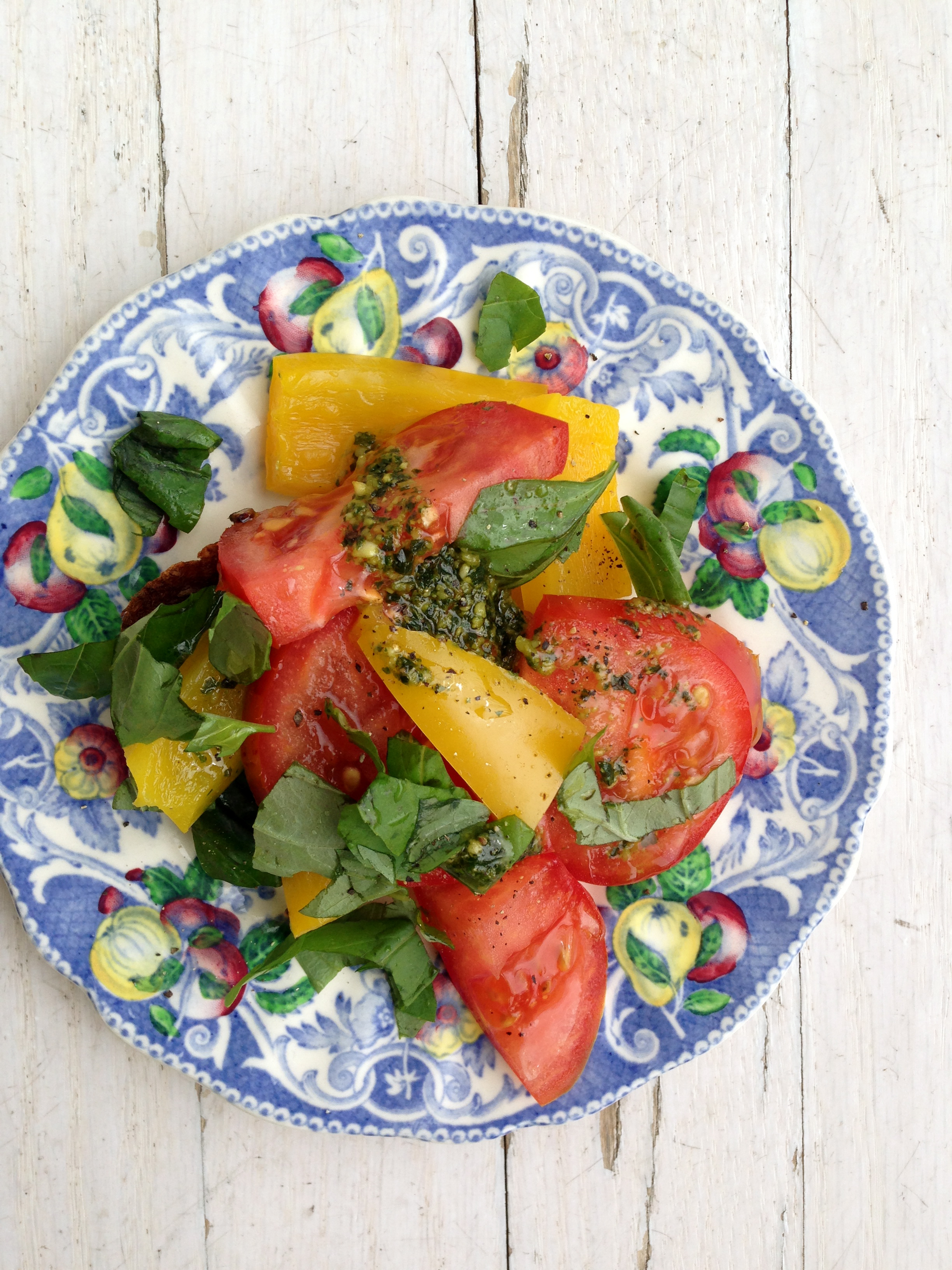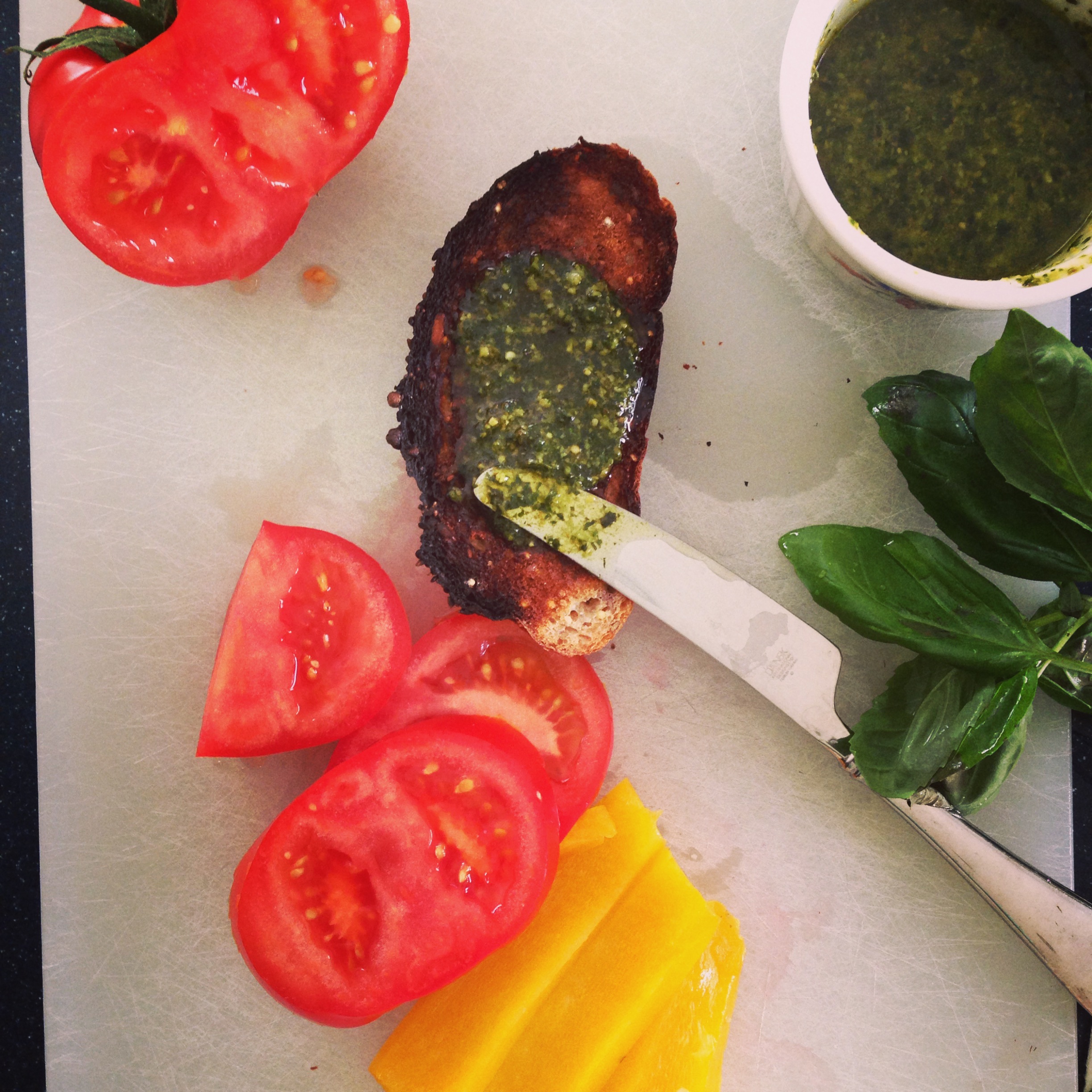 There’s toast under there. Toast spread with pesto, no less, and topped with torn basil (don’t cut it with a knife lest you like your basil black), raw yellow pepper, tomato, a dollop of pesto, and cracked black pepper.