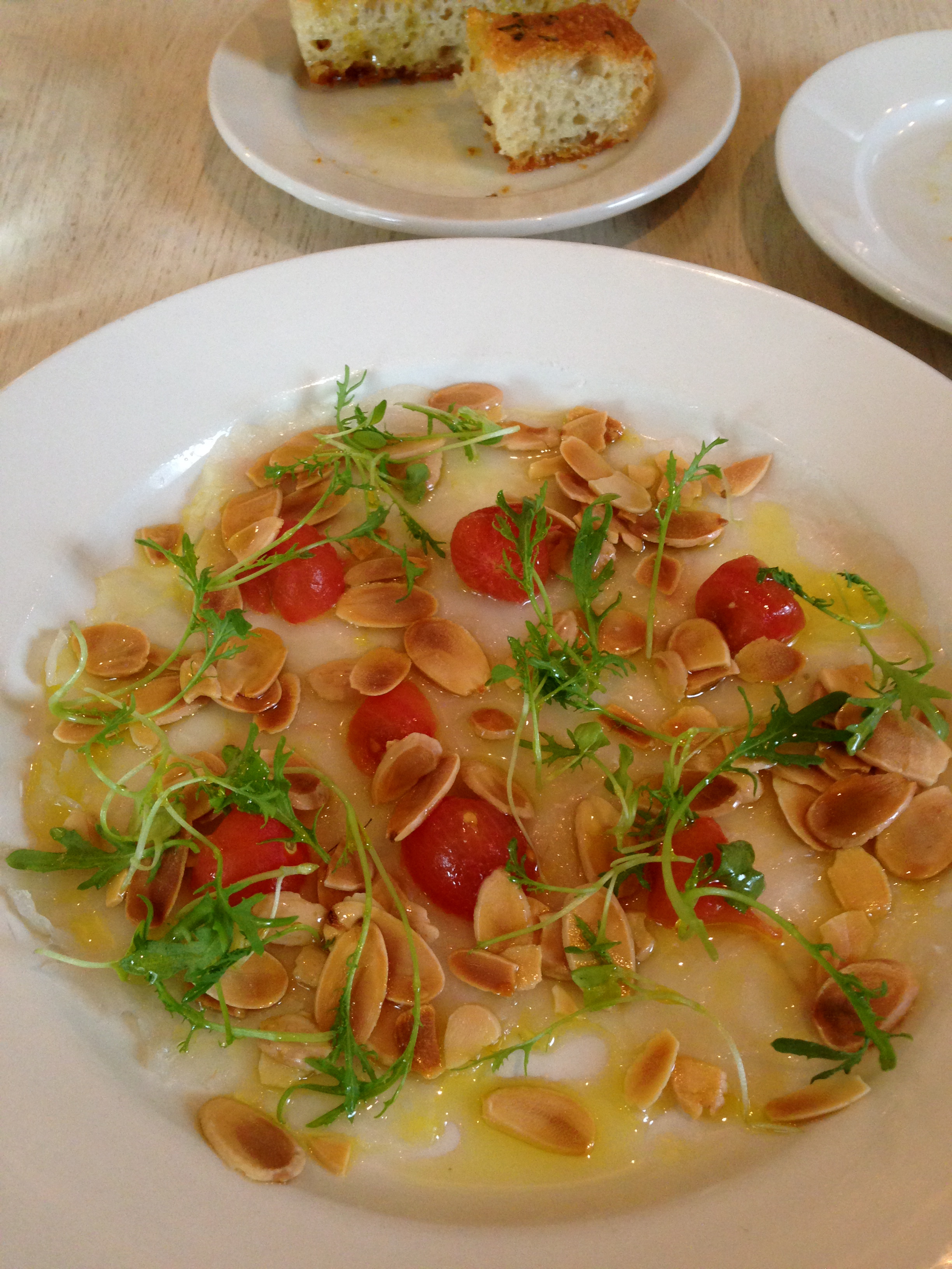 Fluke crudo from early April was a bit too salty for me, but it was plated beautifully beneath the slivered almonds, baby greens, and tomatoes