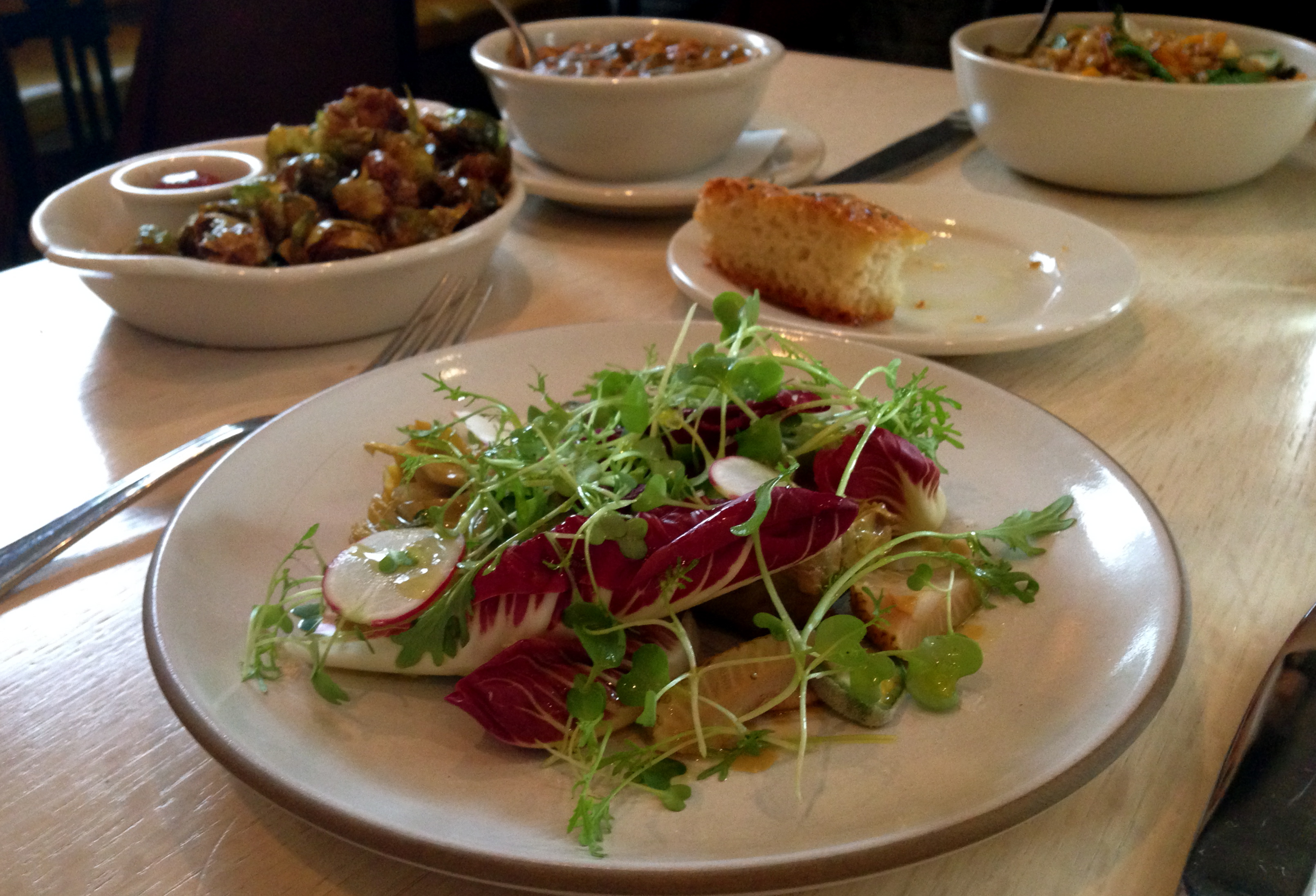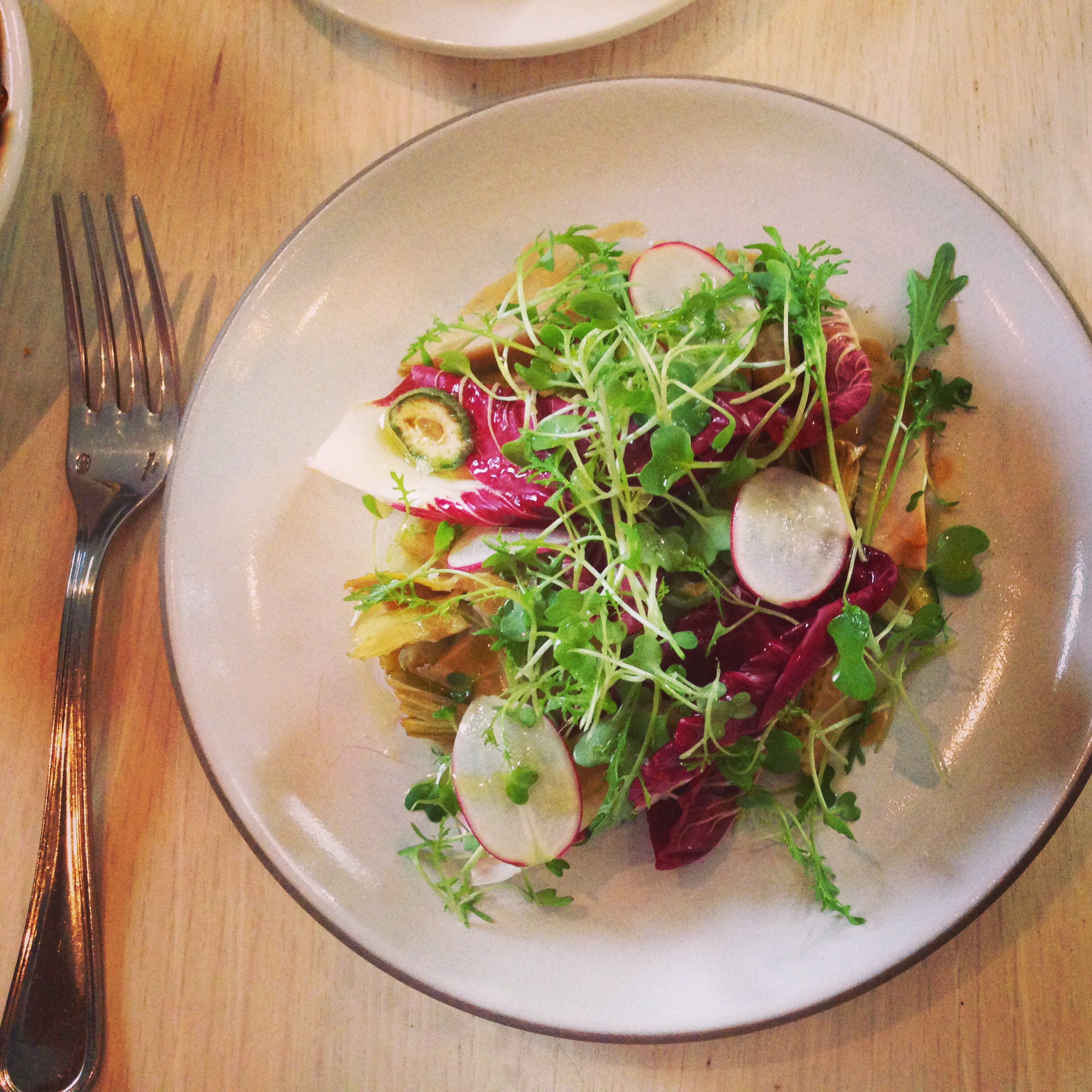 Focaccia, fresh out of the oven and still warm in my fingers, is always a promising start. Topped with rosemary, the bread has just the right amount of spring to it, not too tough but not too oily. On my first visit, my friend’s radicchio salad with tender artichokes and crisp radish was a visually beautiful plate and studded with seasonal sprouts, yellow wonder strawberries, and candied walnuts. This friend is always willing to try a restaurant’s oysters, and she was very happy with that evening’s selection. Another companion cannot stop ordering the razor clams, and while I did not try these dishes myself, I was told by neighboring diners that the rigatoni with spring lamb ragu was rich and fabulous, if not a little heavy on the salt. Also reported by aforementioned neighbor: the braised rabbit with spring onions, pancetta, and fava bean hash was cooked to perfection; ever so tender and with a decadence complimented by the lightness of the favas.
