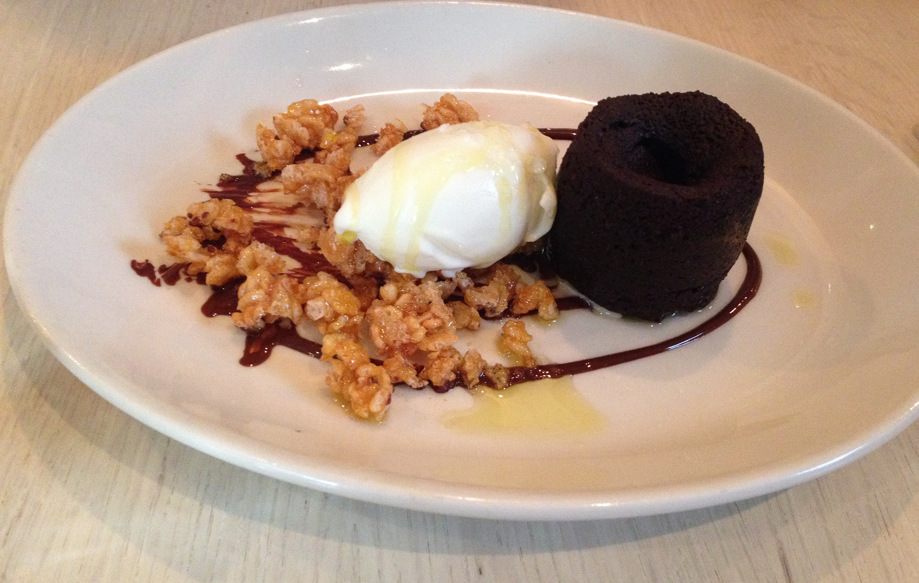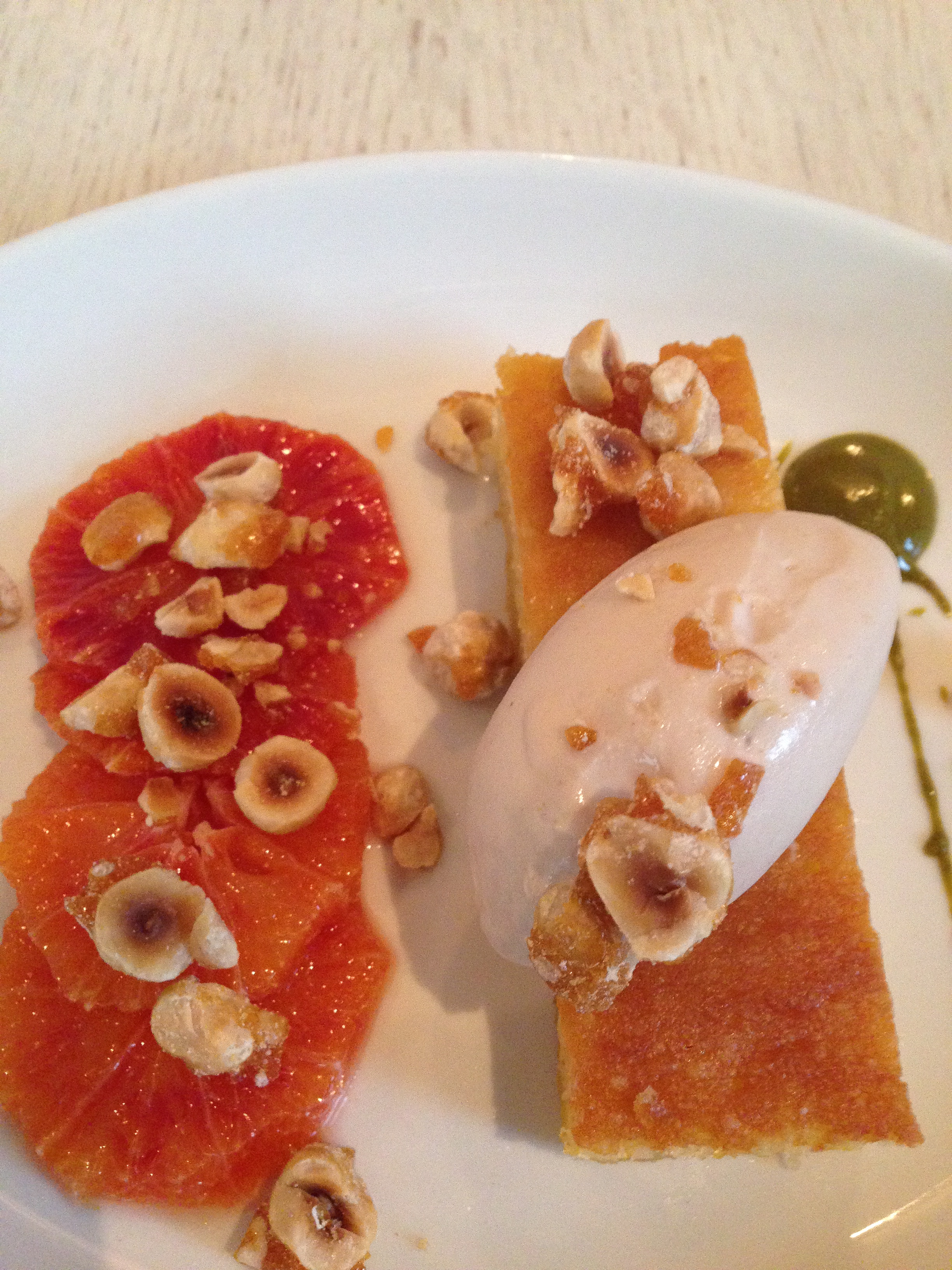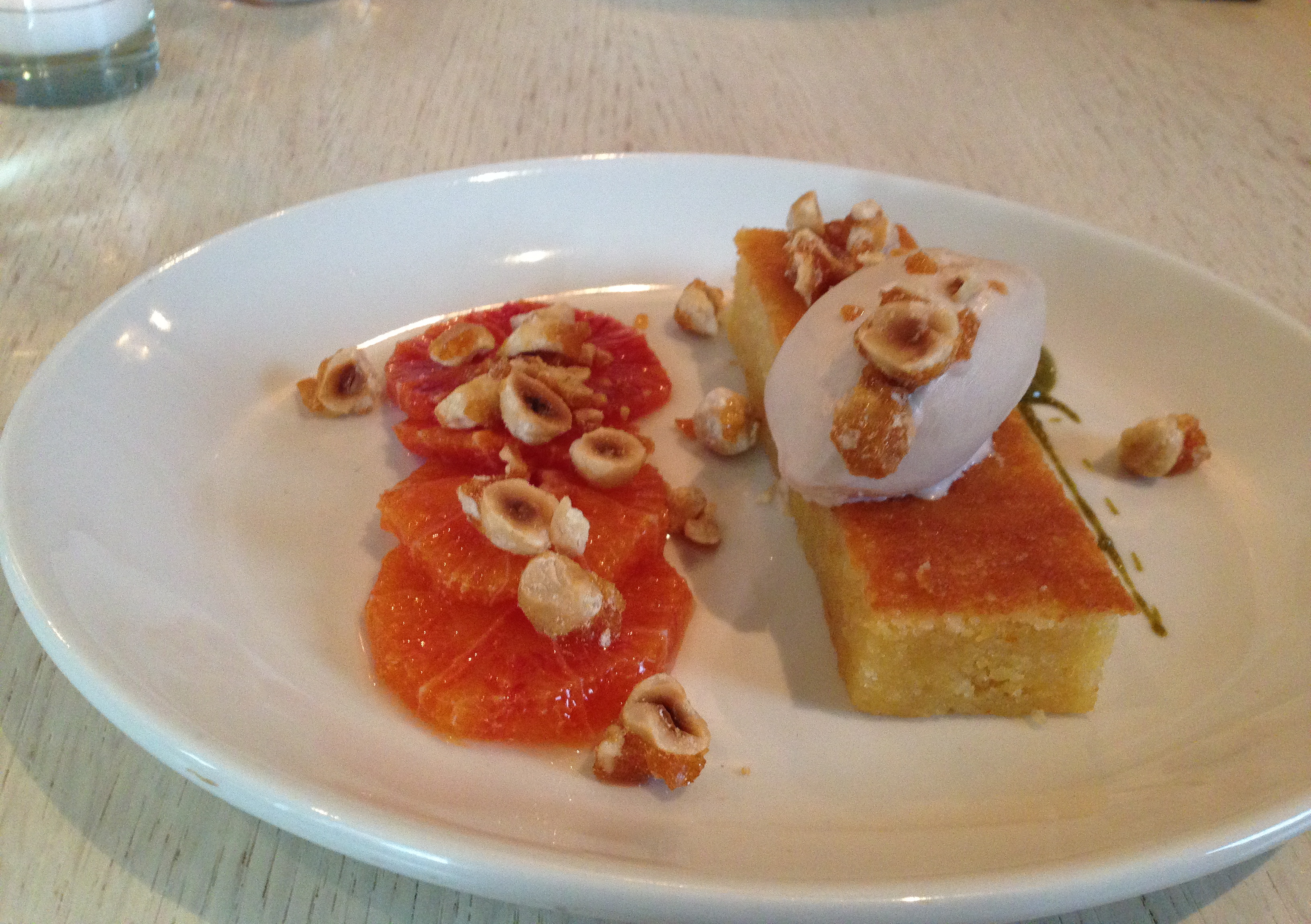 The other item I cannot seem to say no to is the Blood Orange Cake. The first time I indulged, back in early April, the beautiful array of colors arrived in the form of one dynamite lime green circle of pistachio, one exceptionally moist rectangle of orange cake, one scoop of silky caramelized hazelnut gelato, scattered cracked hazelnuts, and a handful of ever so ripe blood oranges, exuding a burnt orange sky as if Hardy took cue from the sun setting over rolling Umbrian hills. This is one of those dishes where one needs a little bit of everything on each forkful; it was simply meant to be savored in this fashion. The chocolate bundino is worth mentioning as well. If you love chocolate, I urge you to order the velvety bundino.
