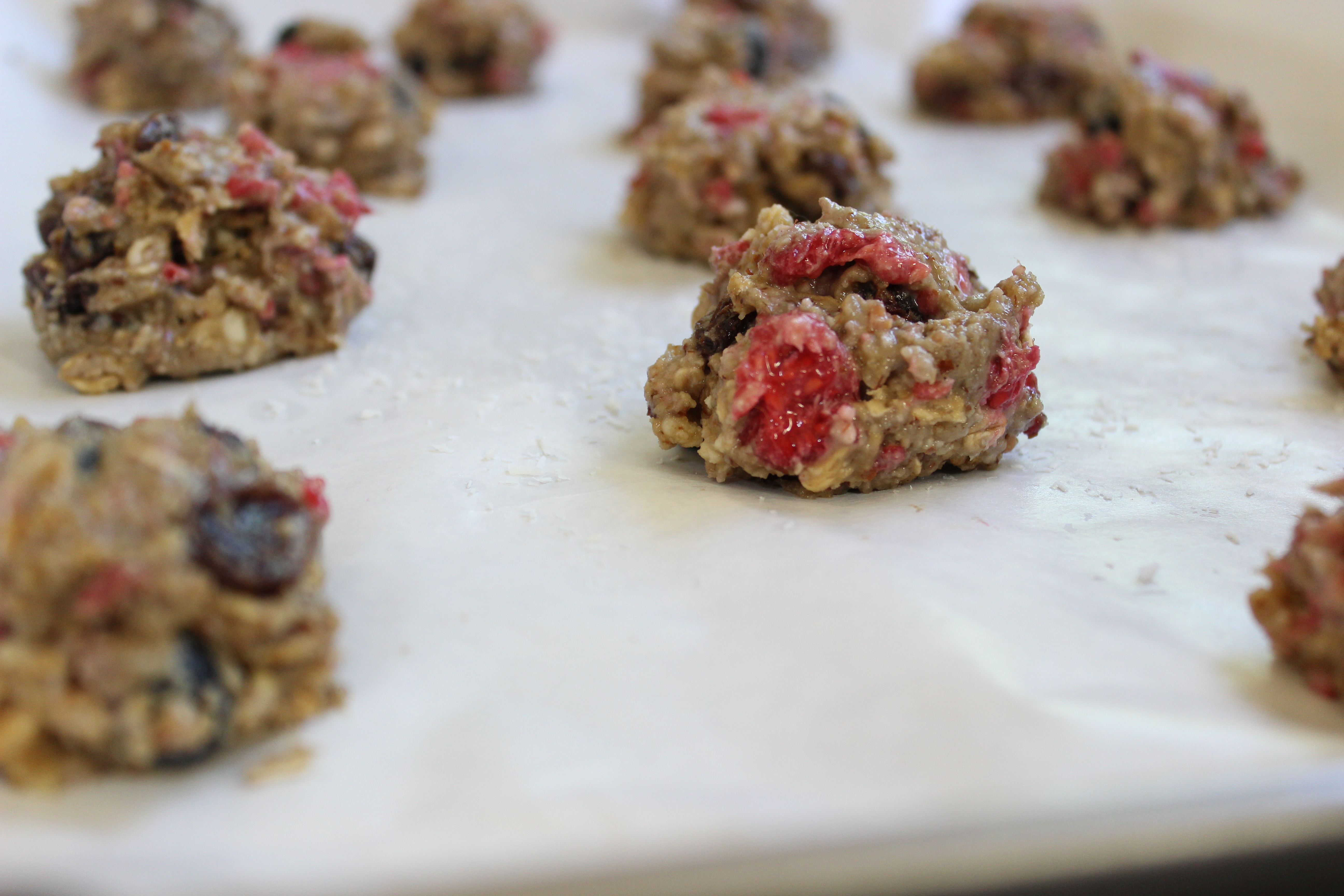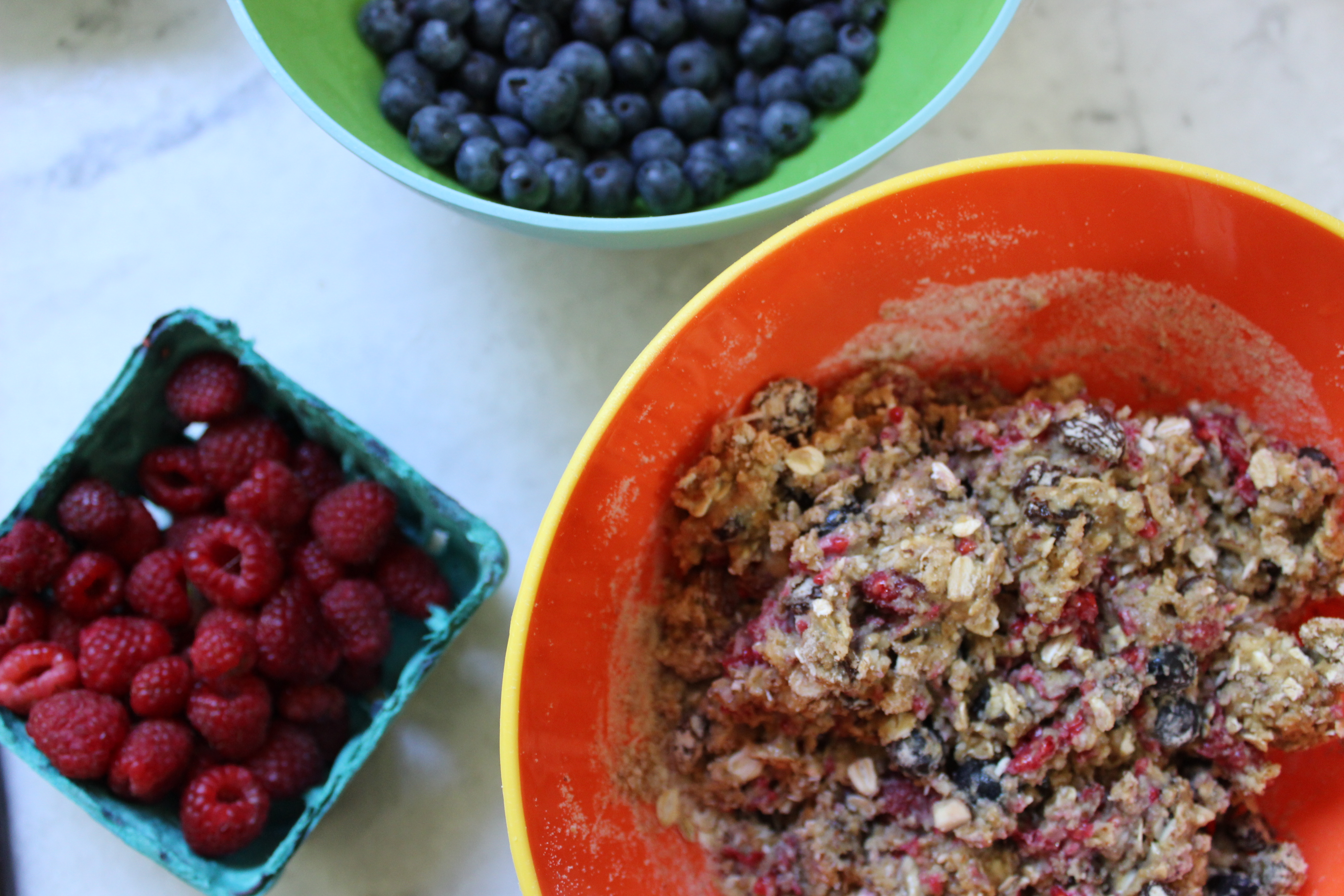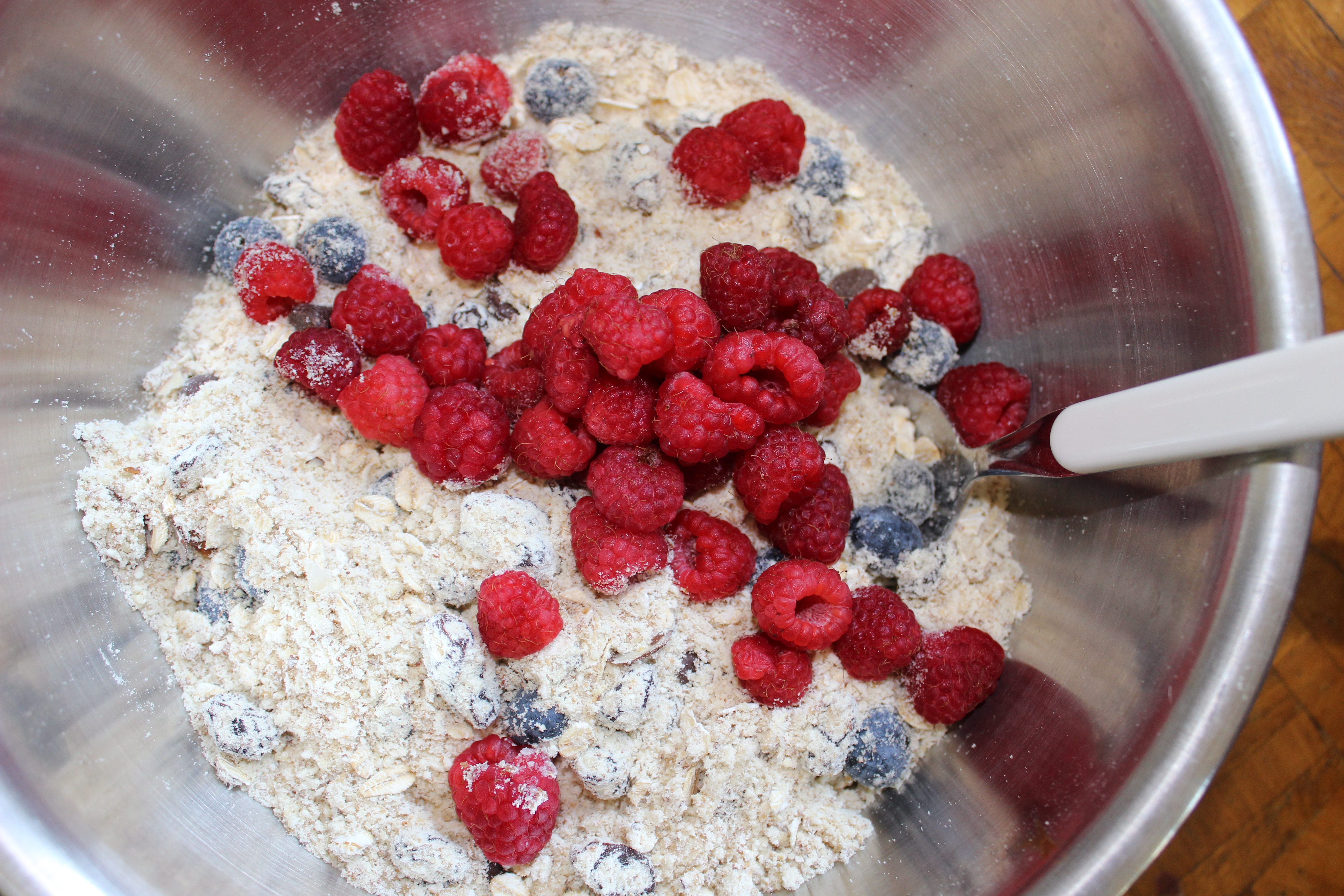 Sift together the flours, oats, baking soda, and salt. Add the cooled, toasted coconut and mix to incorporate. Stir in the raisins, blueberries, and raspberries.