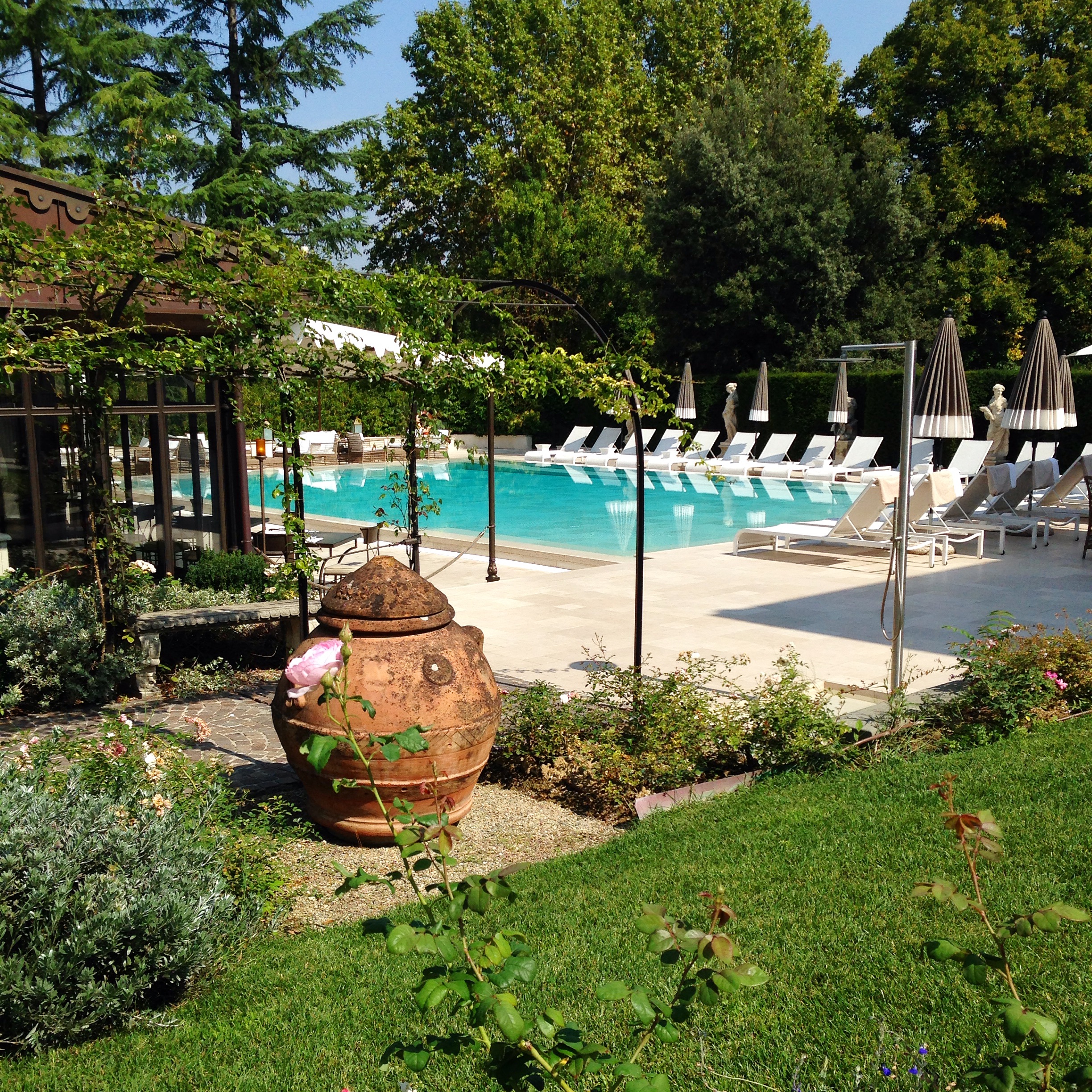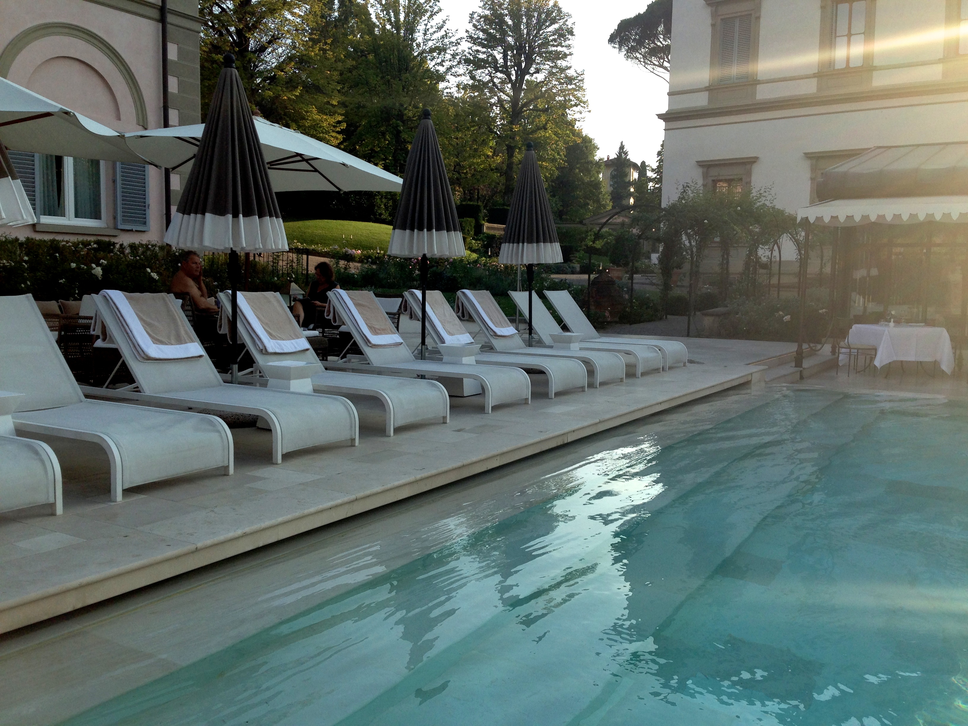 Admittedly, we wavered about staying outside of the city center. We wanted to walk out the door and experience the heart of Florence with all five senses, yet we wondered if it might be something of a treat to escape the crowds. Villa Cora plays the balancing act quite perfectly. The complimentary shuttle takes not even five minutes to reach the Arno, and as we drive up the hill on a mostly residential street, scattered with grand private villas, we feel as if we are going home, (daydreaming on vacanza is encouraged). It is quite special to be only minutes from the center, yet to return to such a tranquil, pristine property carefully strewn with flora and fragrant roses and an outdoor fitness center overlooking the property. We can indulge in an afternoon swim in the beautifully designed pool, with the most aesthetically pleasing pleated umbrellas and water that lapses over the rim like a calm waterfall. We can nurture our tired muscles in the underground spa. What is more humanizing than a sauna and a steam after a whirlwind day of shopping and art-seeing in the center?
