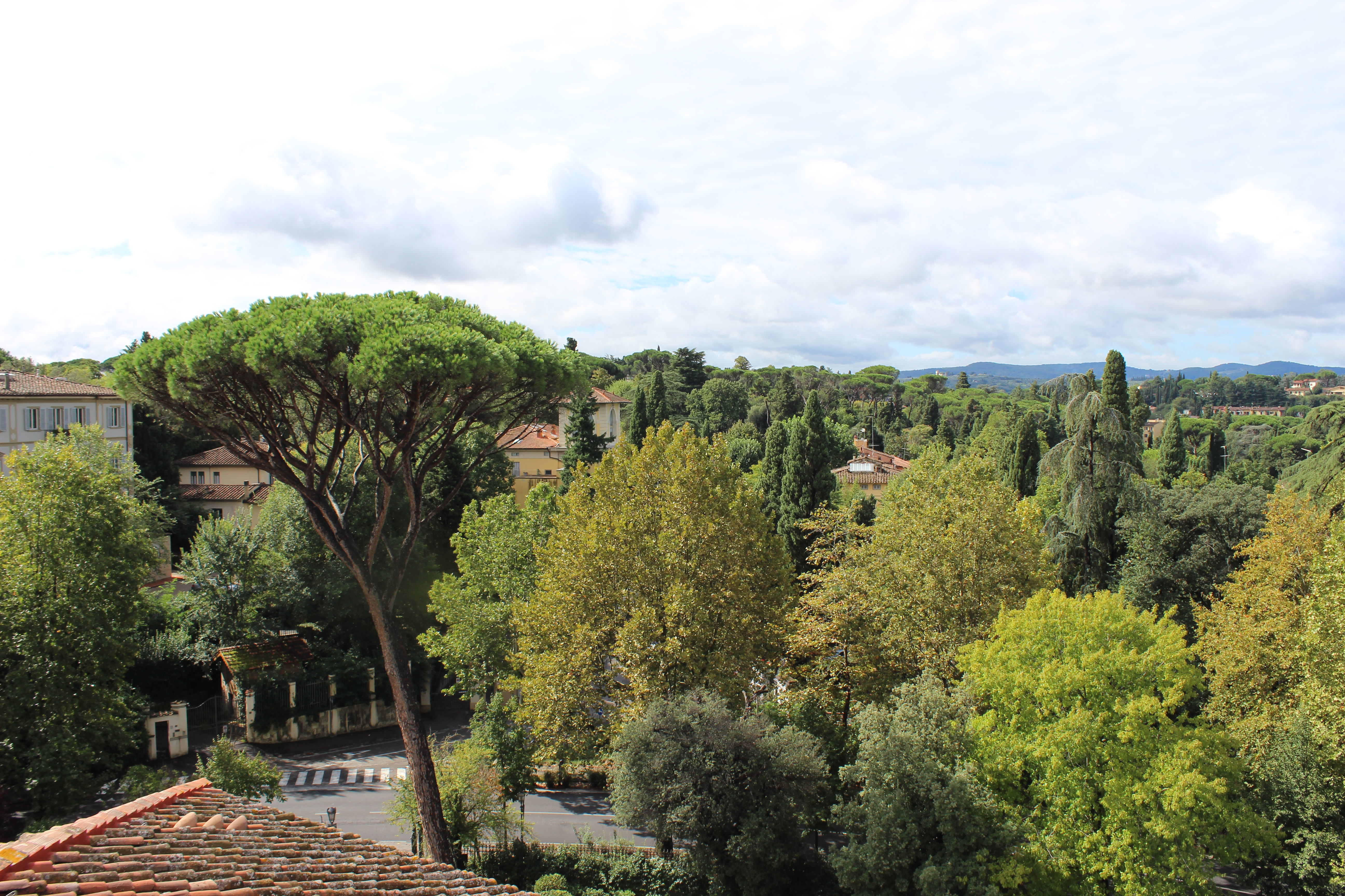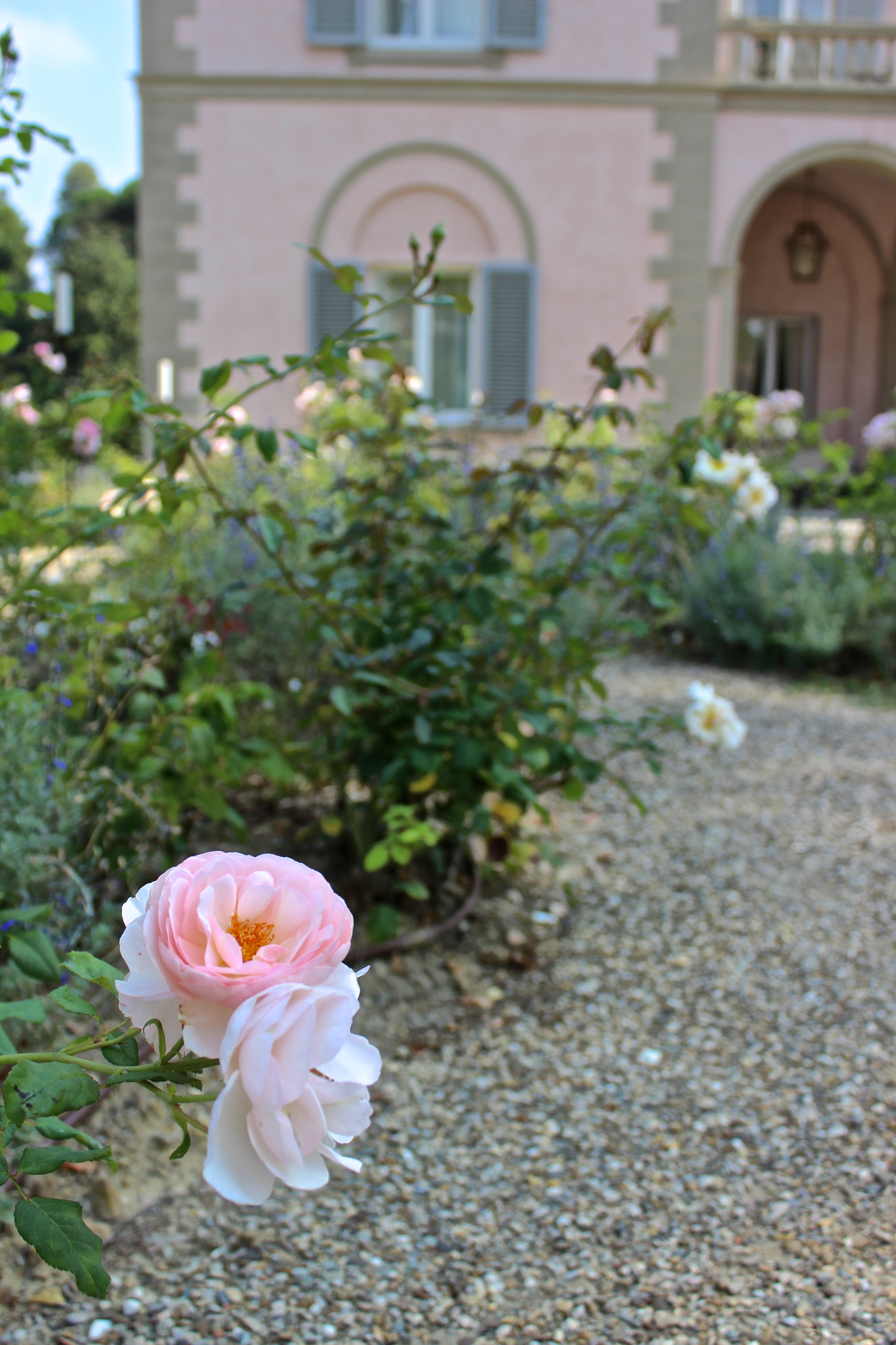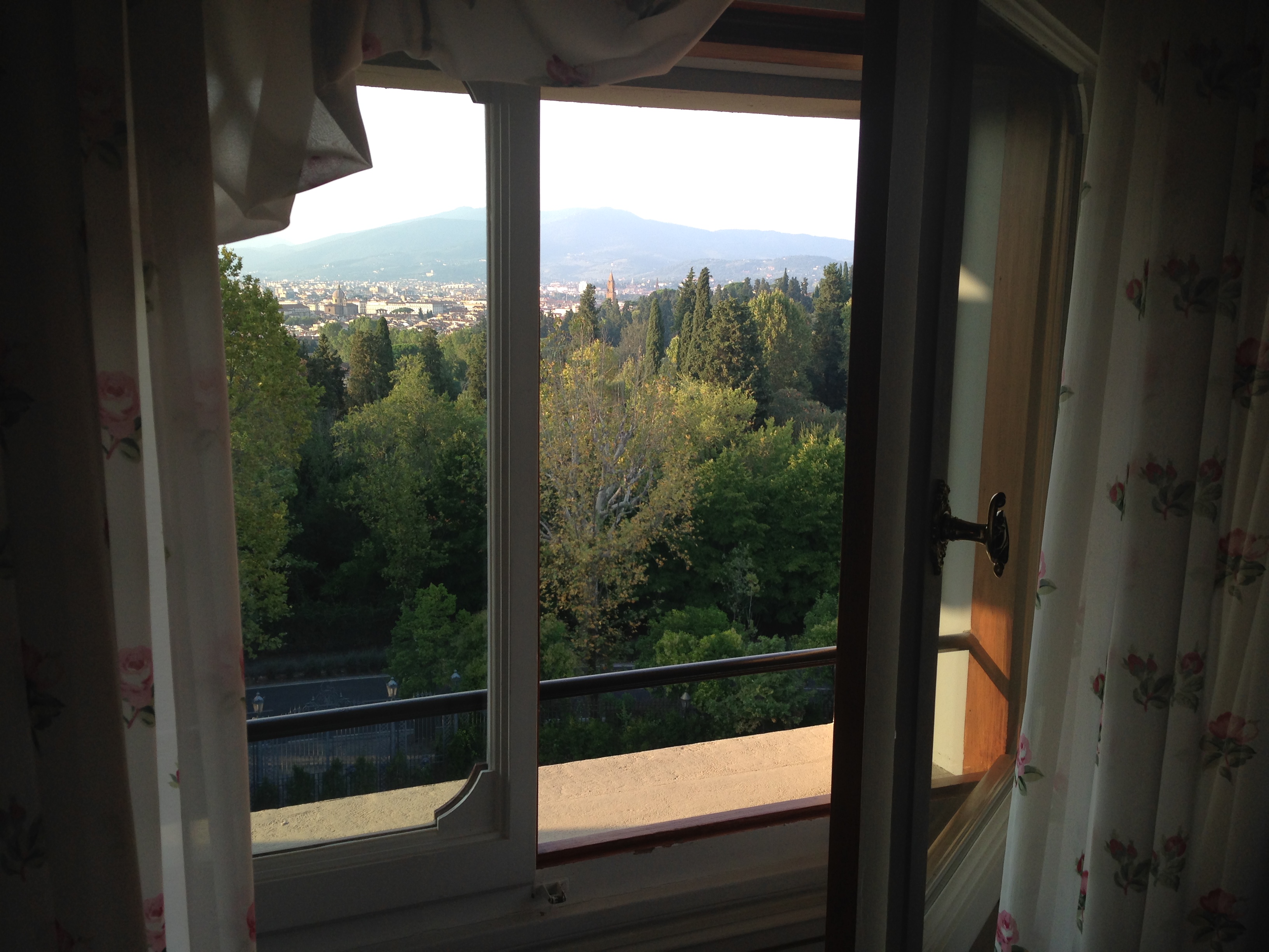 The villa itself was built in 1868 as a wedding gift from Gustavo Adolphus Baron Oppenheim to his bride, Eugenia Fenzi. Indeed from our perch in room 205, with our rose-scented bath products by Santa Maria Novella, our pristine white bathroom, and our canopy bed, I feel a bit like a princess, or at least an aristocrat of some sort. I envision Signora Eugenia looking out the picture window over all of Florence, breathing in fresh Tuscan air, yet only a few minutes from the country’s finest dressmakers and the Boboli gardens. The pink and light green fabrics that adorn our room on the themed ‘Rose Floor’ bring the outdoors in; the greens mesh into the treetops, the pinks perfectly resemble the roses that line the property.