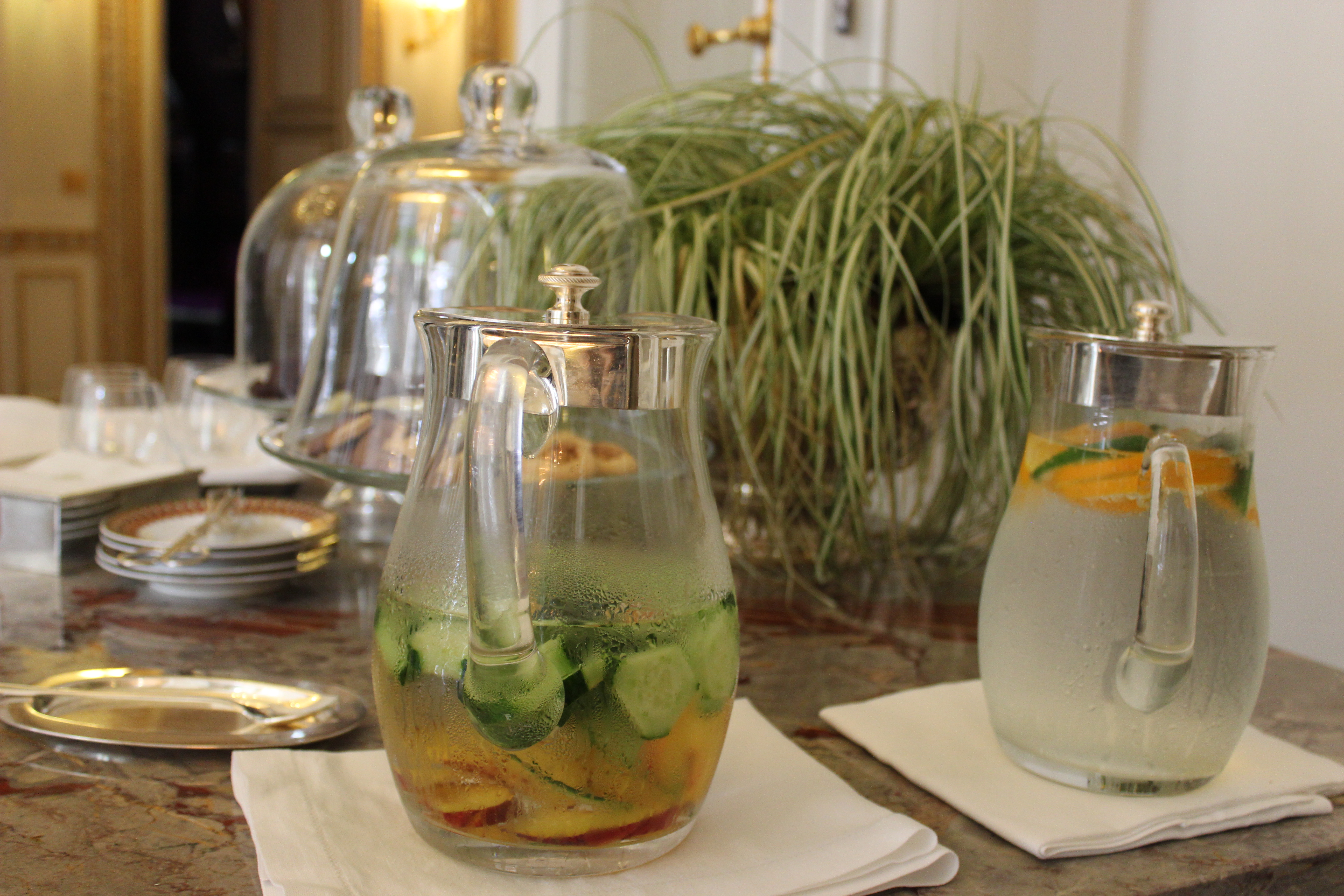 Afternoon refreshments in the lobby at Villa Cora; heavenly cookies and refreshing fruit and cucumber infused water.