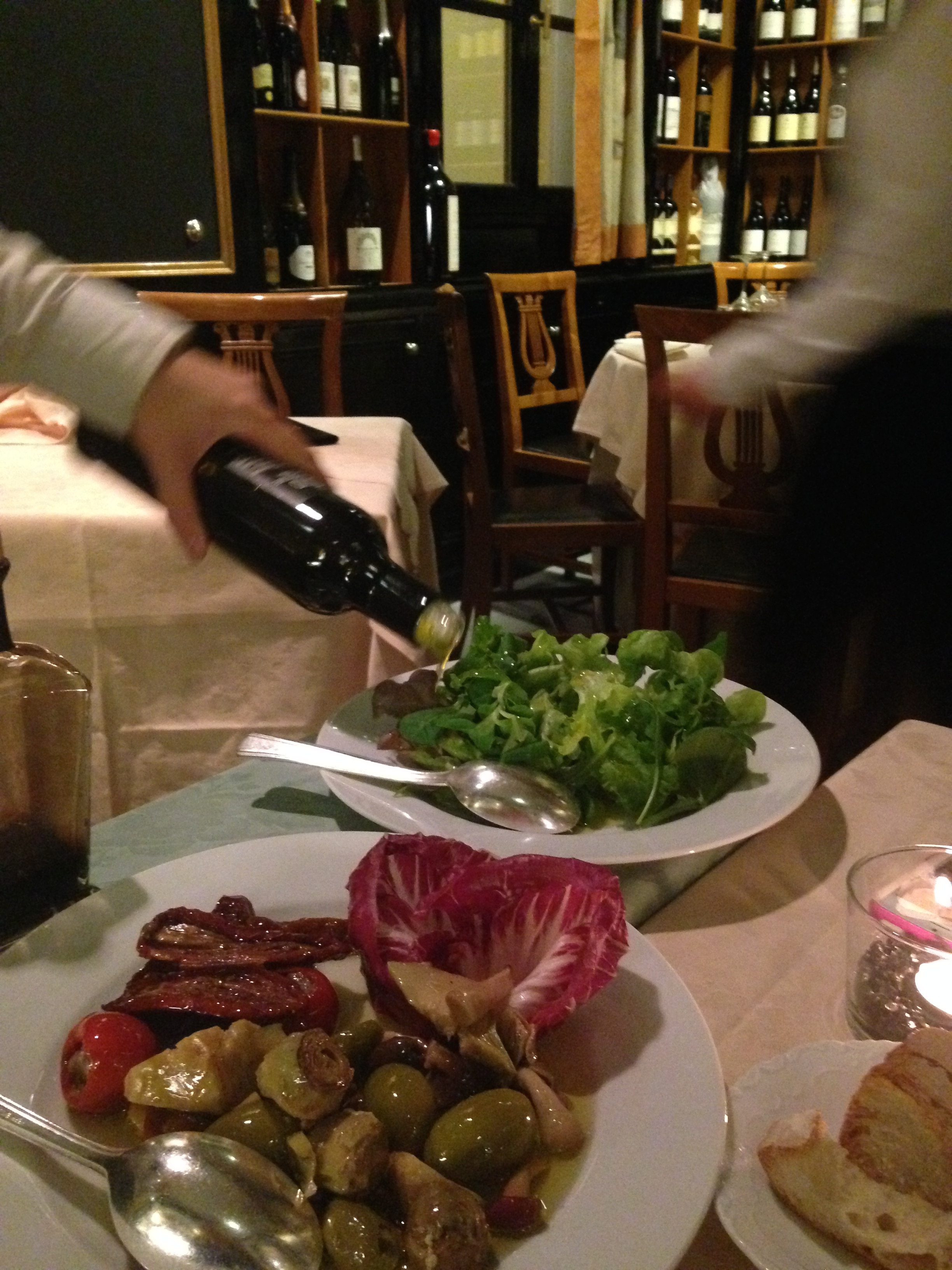 Angelo is equally generous with the restaurant’s offerings. When we request shards of parmigiano, a munificent plate arrives, the rustic pieces served on the same size plate as our secondi, a suggestion of the cheese’s centrality and essentialness at every Italian dining experience. We order a green salad, fully expecting a basic bowl of greens, but to our great surprise, a beautiful plate of fresh leaves is presented. Angelo sets up a side table for our antipasti: the salad sits next to a quintessentially Tuscan offering of verdure sott’olio: mixed olives, small hot peppers stuffed with capers, tender artichokes (carciofi), raddichio, the most beautiful baby mushrooms, and tangy sun-dried tomatoes.