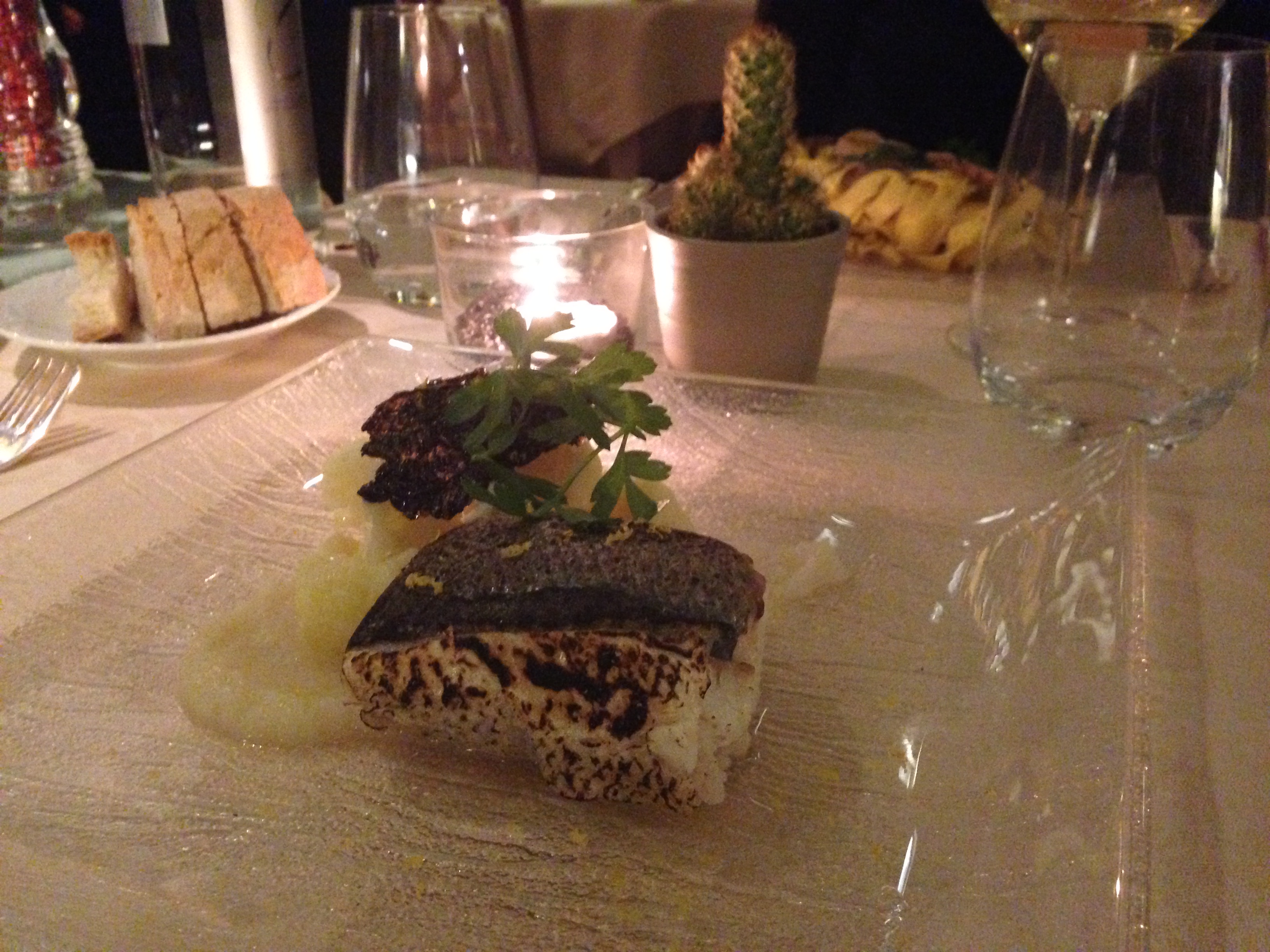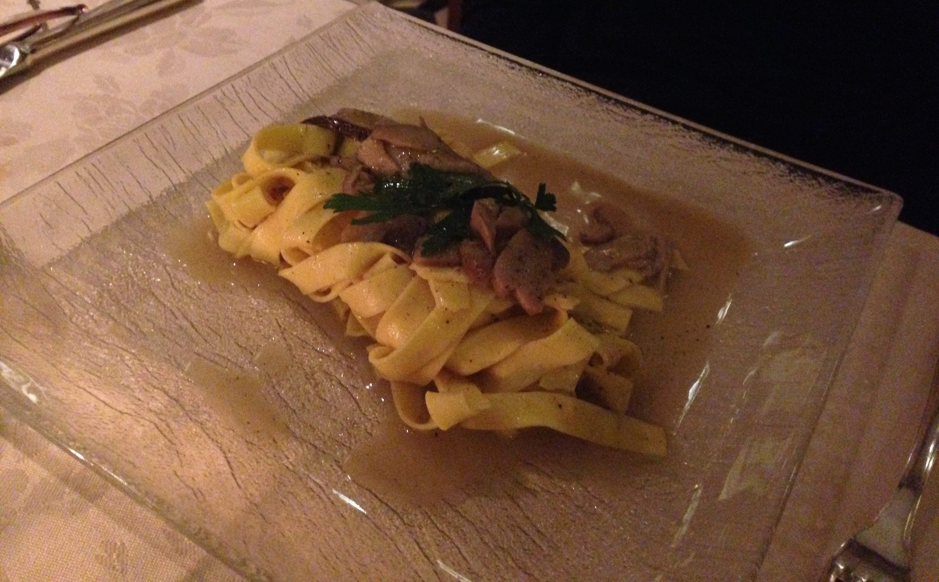 The specials of the day are on the blackboard, and in addition to these ever-changing options, the written menu changes every few days as well. On our first night, (we returned a second time in the same week), I order the sea bass with a cauliflower purée and an air of peach tea. Angelo assures me there is no cream and no butter: the puree is purely olive oil and cauliflower, certamente. The sea bass flakes at the delicate pressure of my fork, the cauliflower puree is none too thick nor too thin; and it is topped with one or two whole florets. The homemade tagliatelle with porcini mushrooms is exquisitely presented; the mushrooms are tender, the tagliatelle lightly dusted with black pepper and gently coated in fantastic Tuscan olive oil. One parsley stem sits atop the ribbons of al dente pasta.