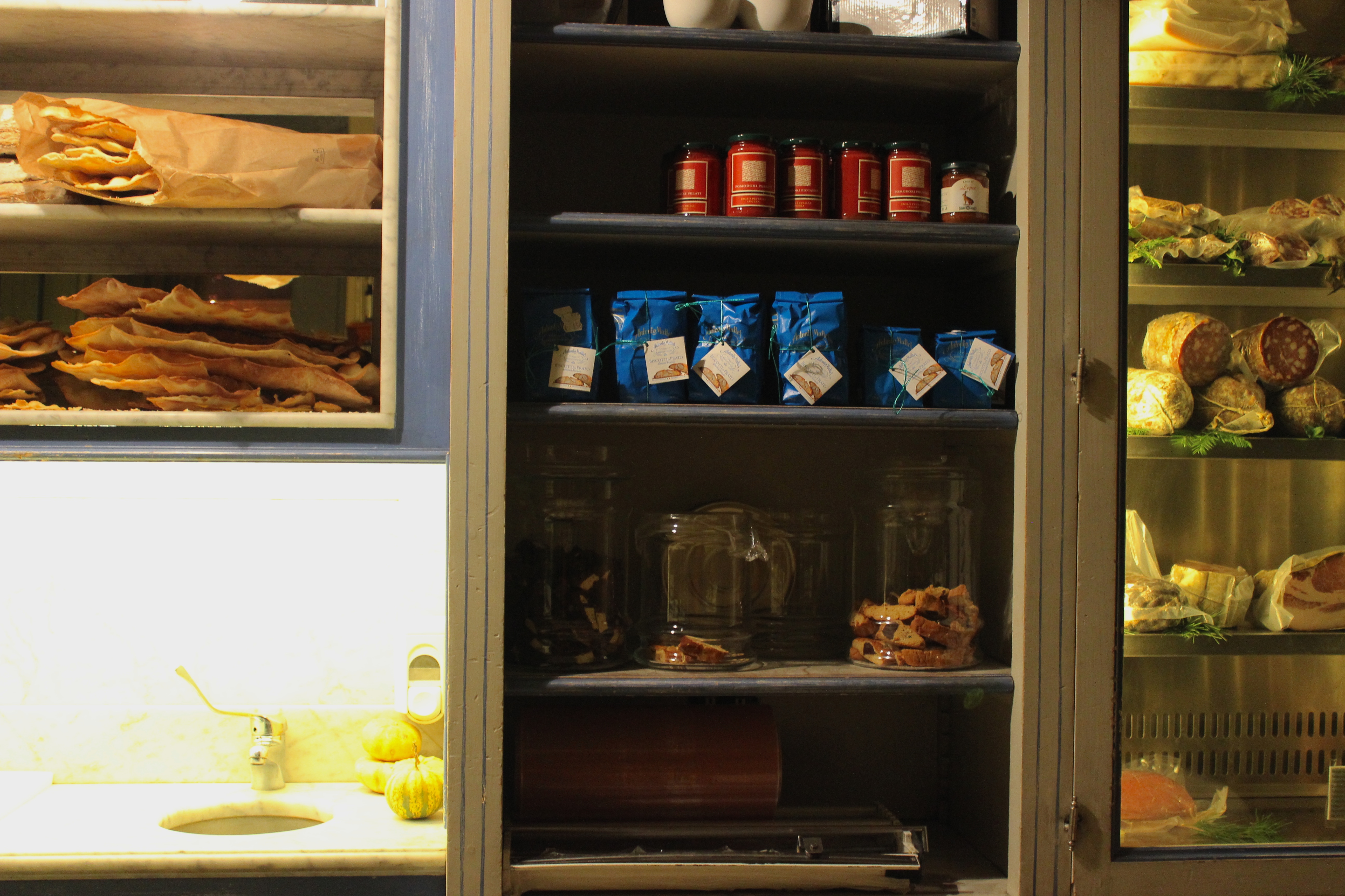 Mista del produtti: jars of the best homemade biscotti I have ever had, coffee, cured meats, and flatbread.