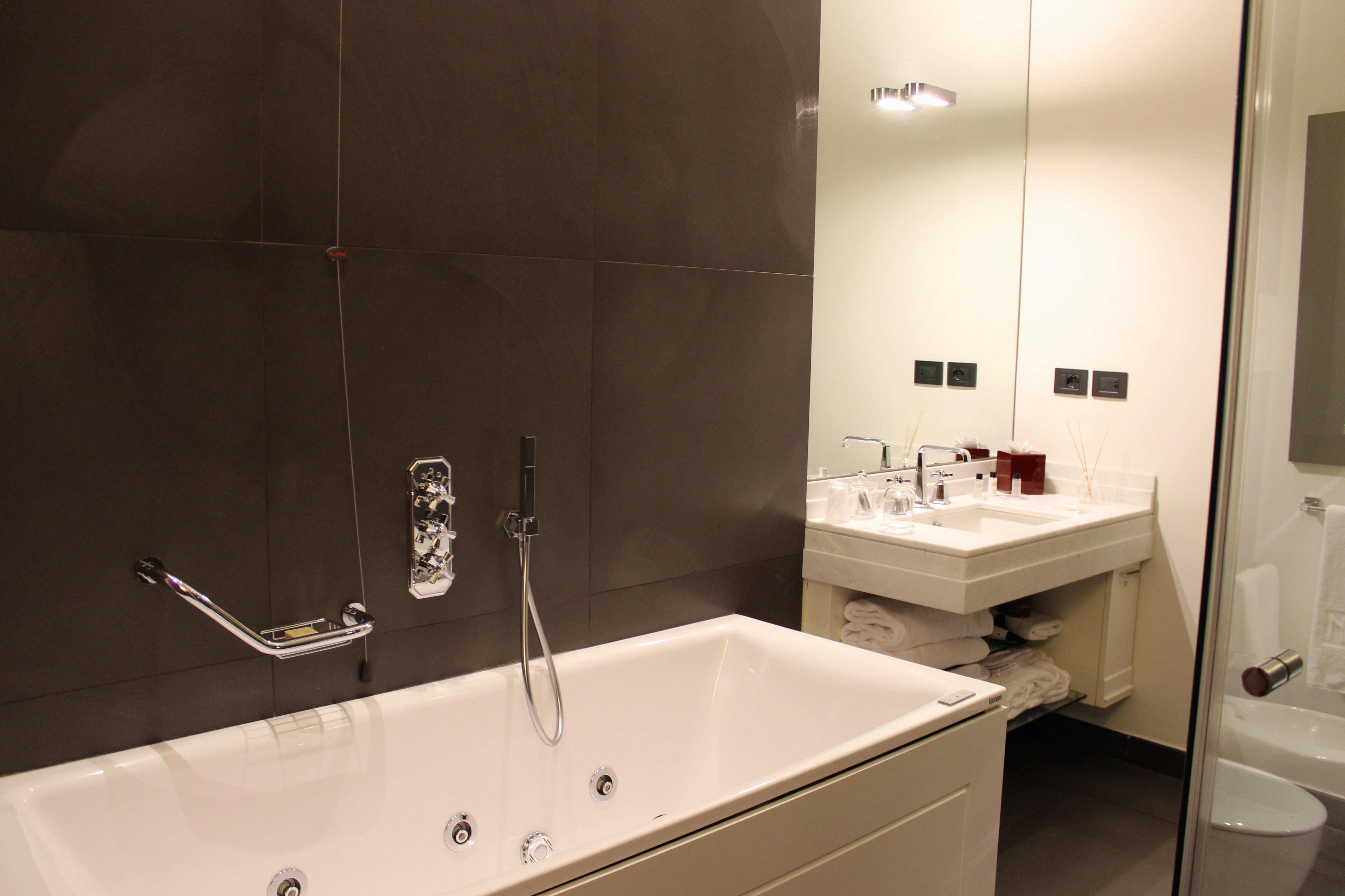 The immaculate guest rooms are the most modern areas. Purple remains the constant key accent color, with the rest of the room decorated in fresh, clean white. The bathrooms are a composition of dark gray tiles and white marble. Perhaps the intention was to offer the guest the most modern experience possible in terms of lighting and electricity, but I was confounded by the amount of power switches, and each time we entered the room and turned on one switch, every possible power outlet in the room flipped on as well, including the televisions. The bathroom proved equally complicated; although the bathtub in our first room (we were upgraded on our second night), was oversized and looked incredibly sumptuous and extremely tempting, we could not for the life of us figure out how to turn on the main faucet without soaking ourselves with the handheld shower. I found the bathrooms in our second room to be more smartly designed.