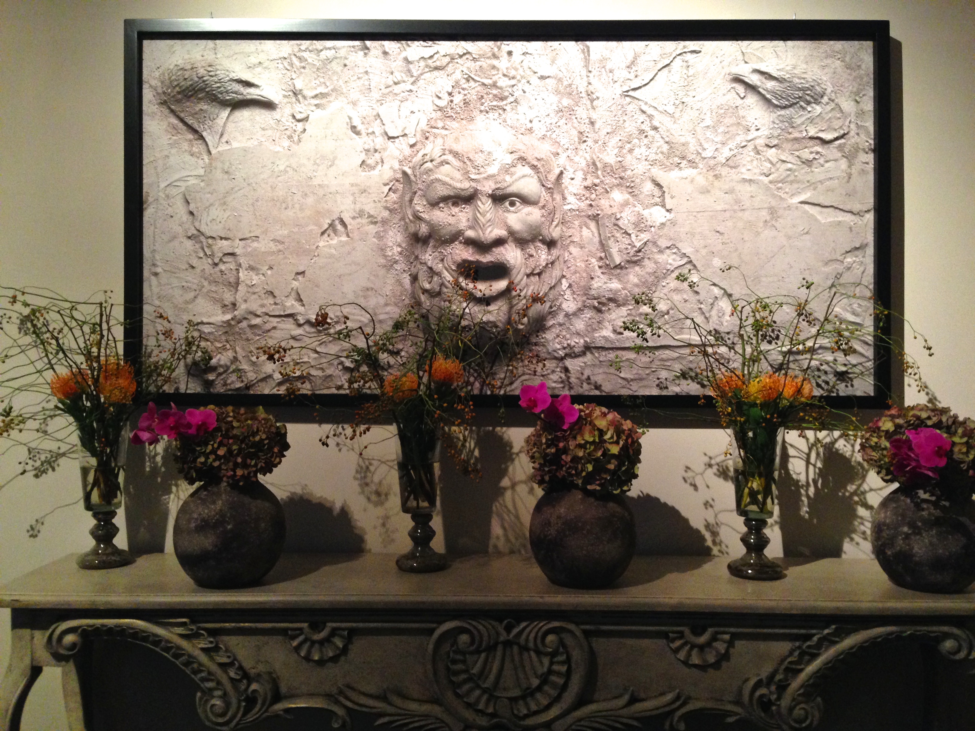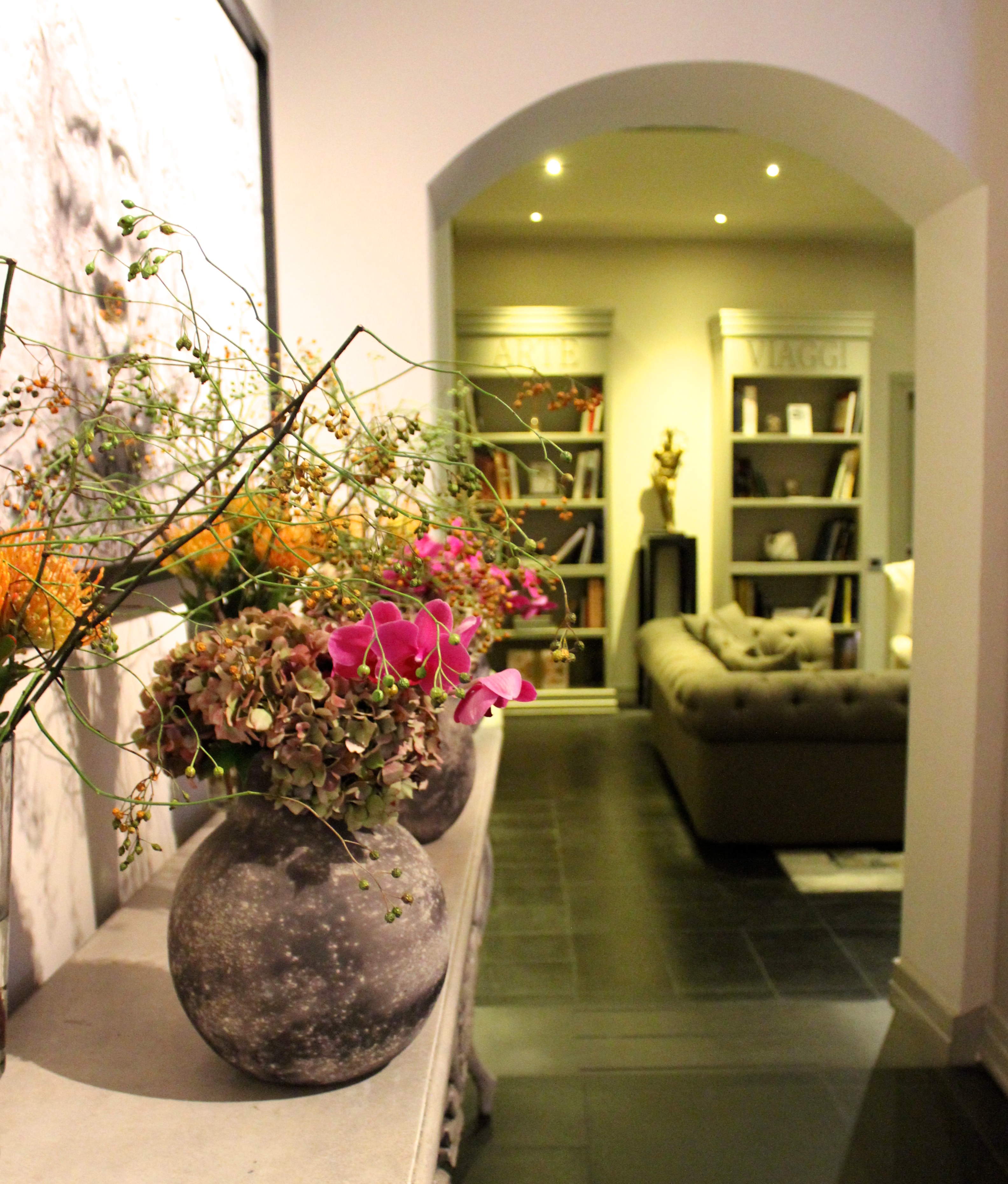 At Firenze Number Nine, the entrance rooms are adorned in neutral colors and classic Florentine materials including stone and marble. They are juxtaposed with bright flowers, oversized chairs draped in deep purple velvet, and pops of orange as accent color.