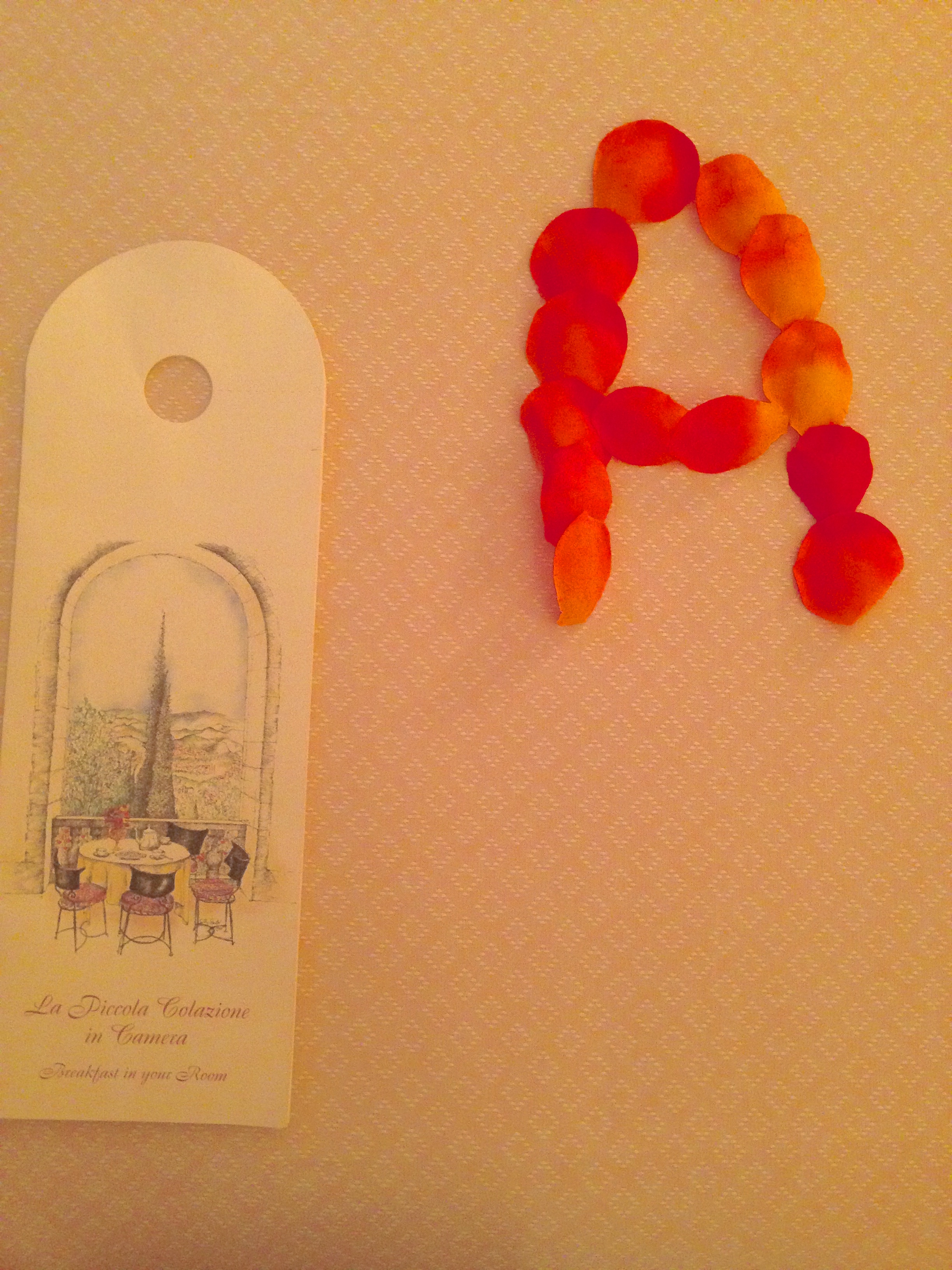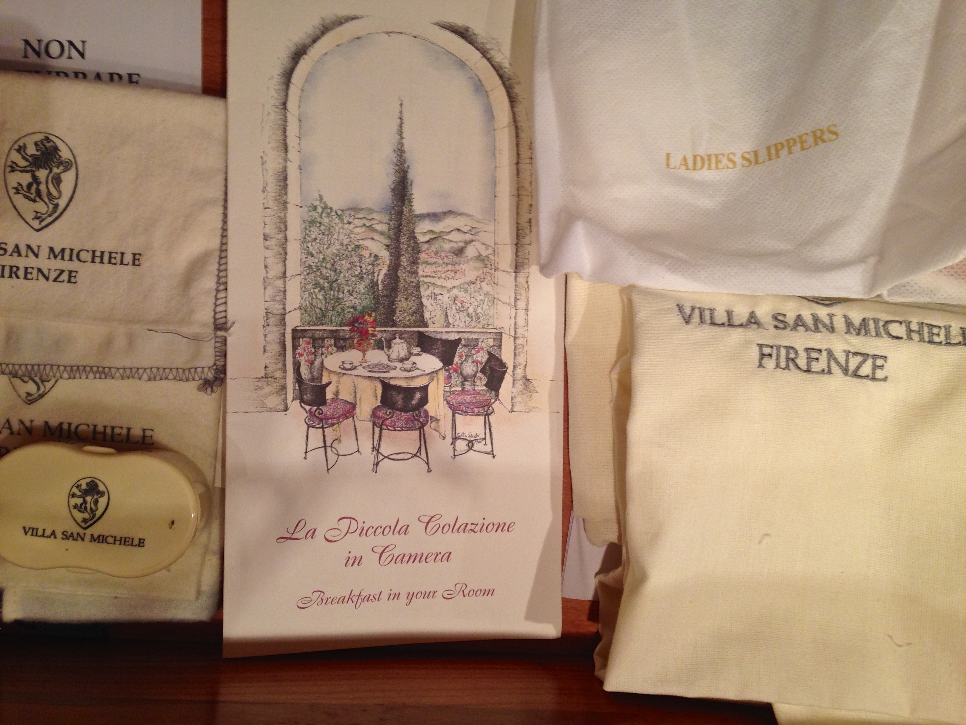 When we are on vacanza, we tell ourselves that it is okay to indulge in four hotel breakfasts each morning. For some reason, our appetites multiply in direct proportion to the length of the spread, and if I had zero self-control, I might still be at the breakfast table at Belmond Villa San Michele. Perhaps that is why I am devoting a post solely to breakfast, and also to our sumptuous bathroom and the divine turndown service. (Please do refer to previous posts for photos and summaries of the lush grounds and also aperitivi hour.) The property boasts many magnificent characteristics: the meticulously manicured terraced gardens and pathways, the ancient structure itself with airy salon rooms and a scrupulously restored fresco of ‘The Last Supper,’ and the wholly encapsulating view: blue skies for breakfast and an impressionist’s menage of pastels at sunset.