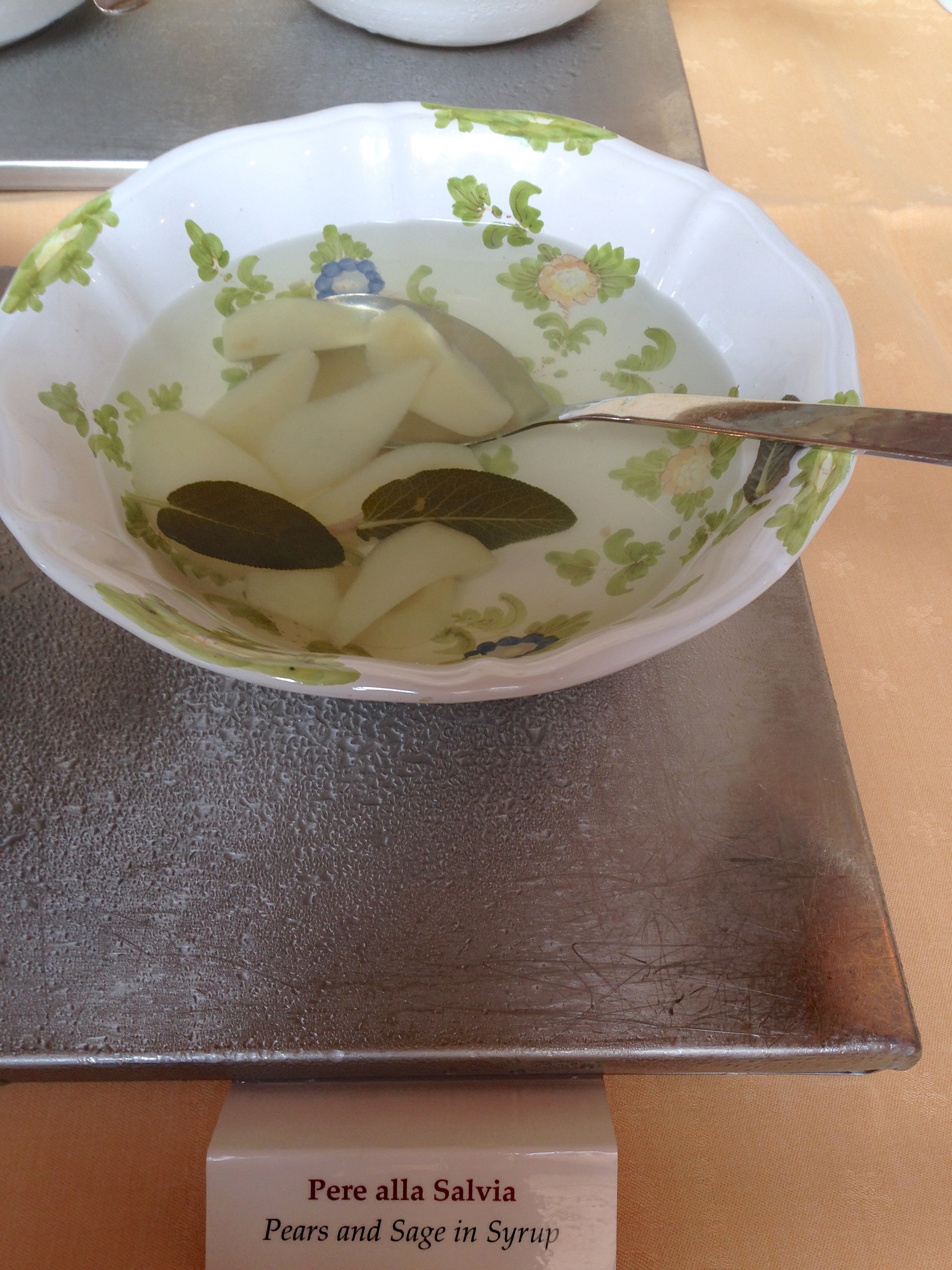 In the morning, after the sun rises over Fiesole, guests trickle onto the veranda overlooking Florence to begin their day with breakfast and a view. Everything on offer is delivered from nearby Tuscan farms or otherwise grown or prepared on site; nothing is presented unless it is at the height of its season. The frutta di stagione is a beautiful assorted rainbow, and while many other Italian hotels offer very little fruit at breakfast, (Italians tend to keep it simple with a brioche), the frutta offerings at Belmond Villa San Michele make up for any previous hotel breakfast that may have been lacking in this category. Juicy green figs, bright pink grapefruit and orange, Italian plums, ripe melon, and the most comforting, flavorful stewed fruit: pears stewed with sage, apples stewed with cinnamon, as well as the last of the season’s peaches.