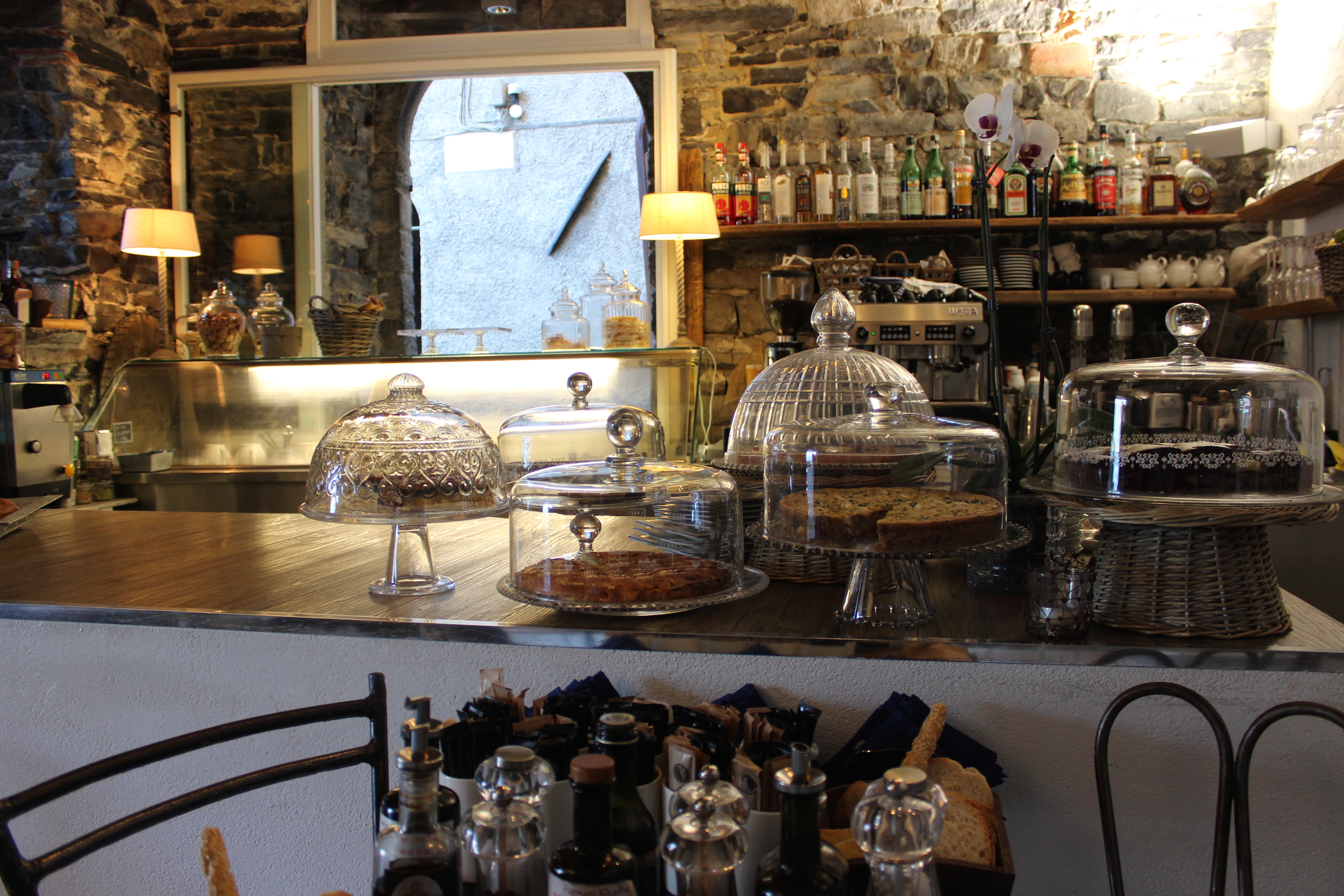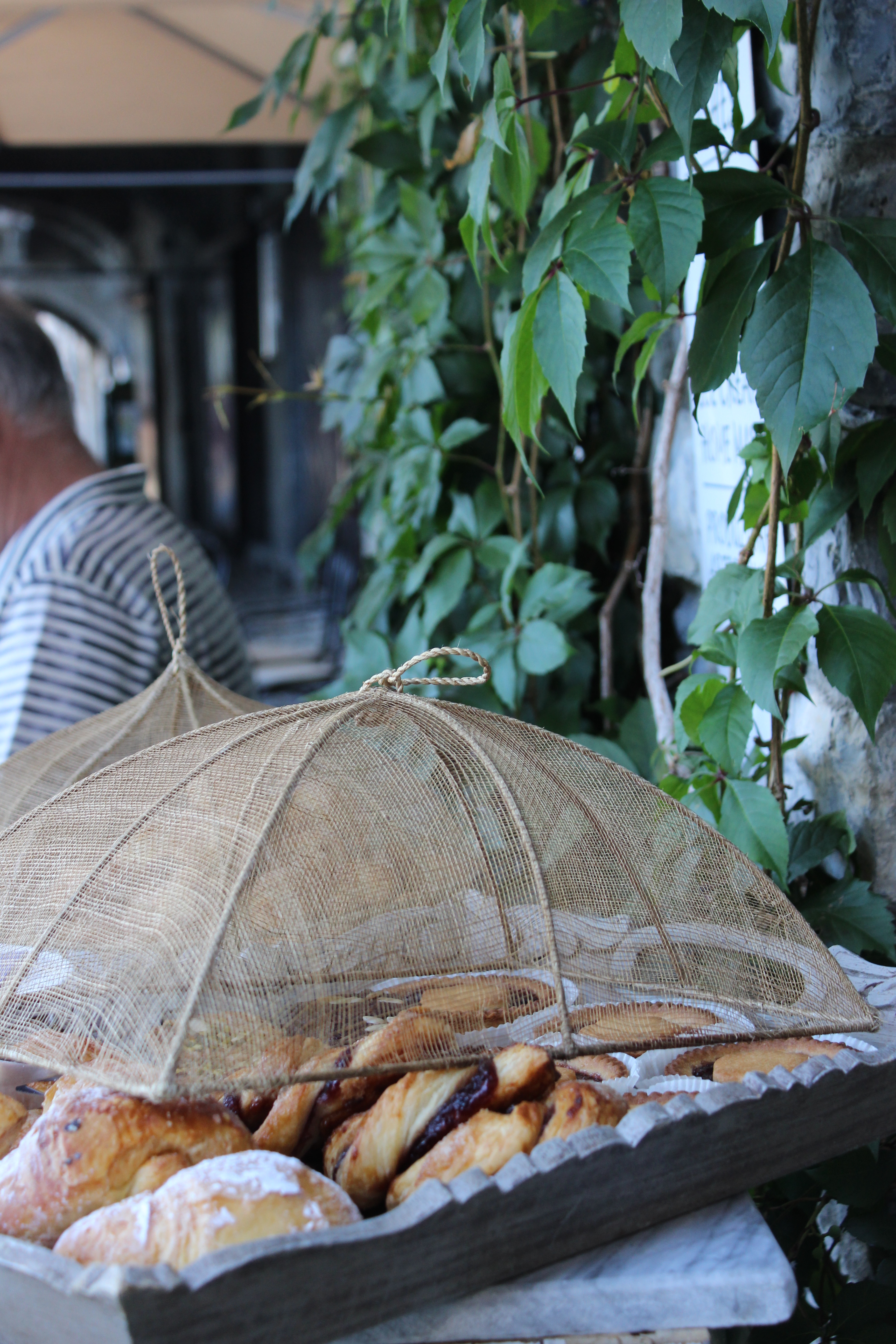 We wander down towards the Lake, passing narrow stone-stepped pathways which conceal more bars and restaurants. Down at the harbor, we find a few more tourists and locals having a cafe or an early lunch at one of the handful of casual cafes. A few look rather touristy, as Varenna is often nothing but a day trip for those staying in Bellagio or Cernobbio, but we find a trattoria with charming outdoor tables and wooden baskets brimming with pastries just a few feet from the lake.