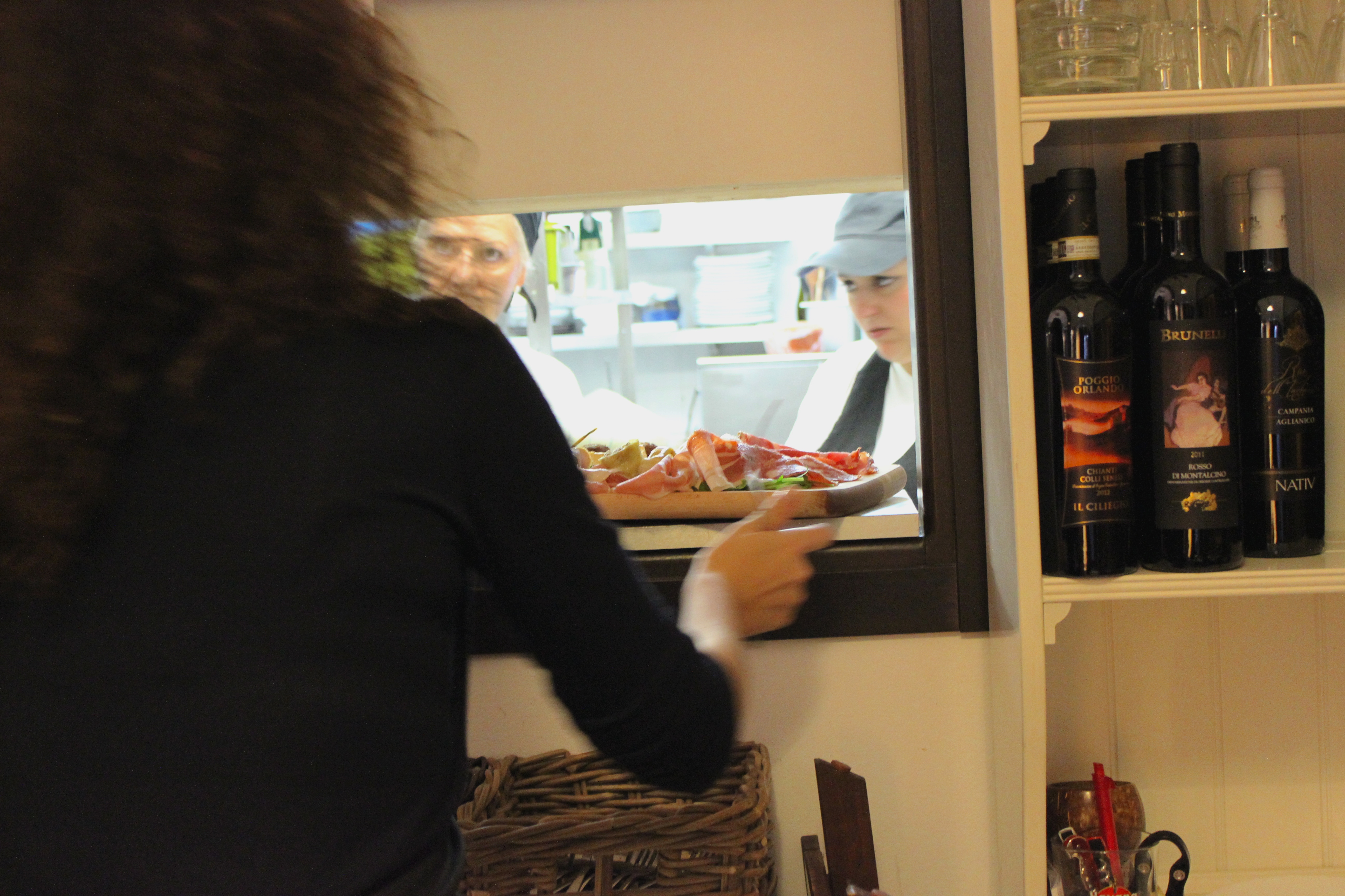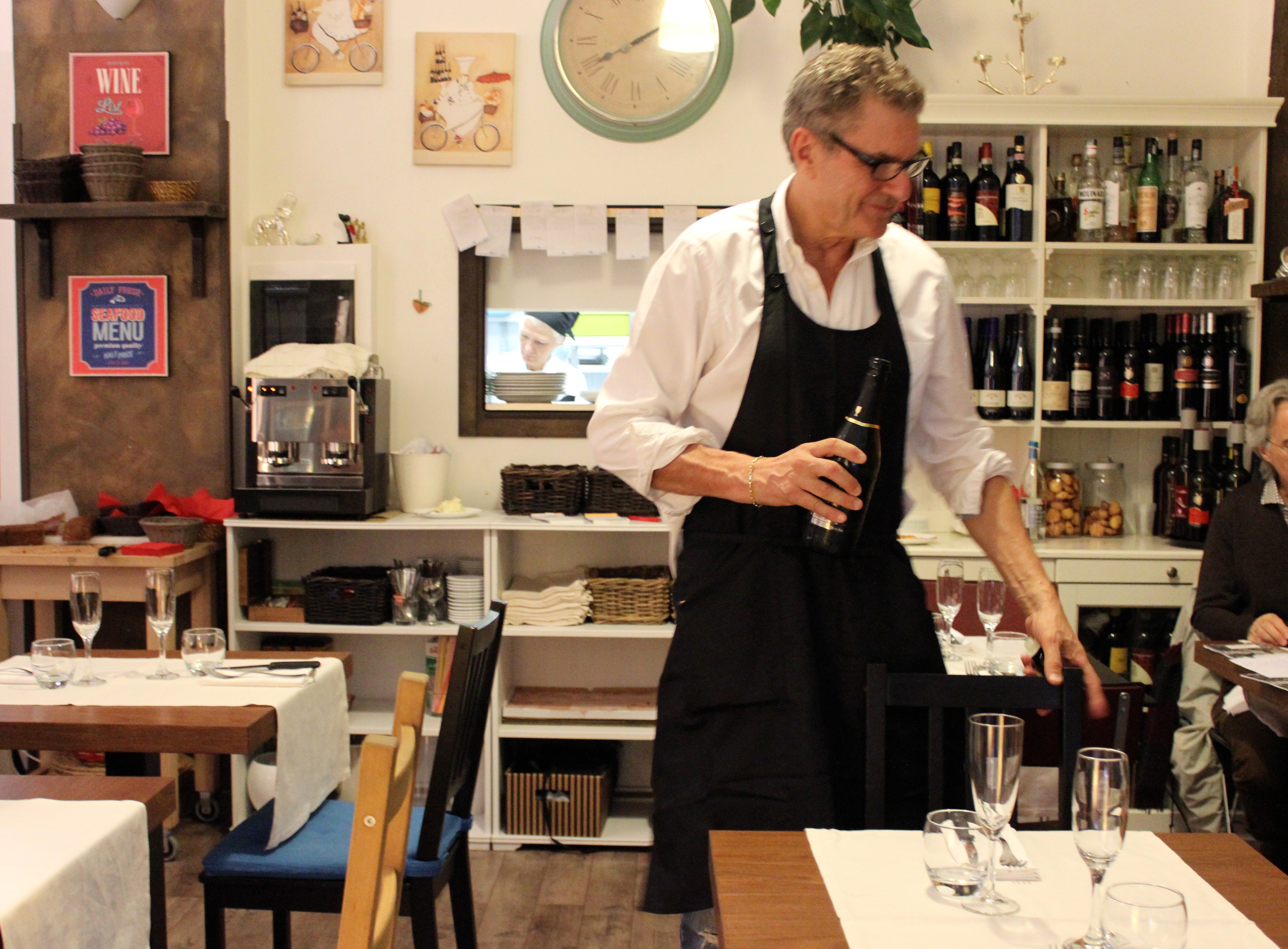 Beyond the bread, the fresh fish, the colorful decor, what truly buoyed the evening was the service. Marcello and Diana, with her wild Roman brunette hair and her great laugh, fly about the restaurant as it begins to fill. Patrons are coming through the door as Diana is uncorking wine bottles; she steps away, cork in hand, to offer them the warmest of greetings. As she is carrying a wooden board filled with delectable antipasti to a large table, the phone rings. She passes it to Marcello, who after turning a few walk-ins away, takes a seat at the head of a table to discuss his customer’s dinner. With pen in one ear, the phone unforgotten in the other hand, he holds court. Laughter all around, vino for everyone. I love any host who sits down at my table to take my order, as long as he is Marcello (Mastroianni or not).