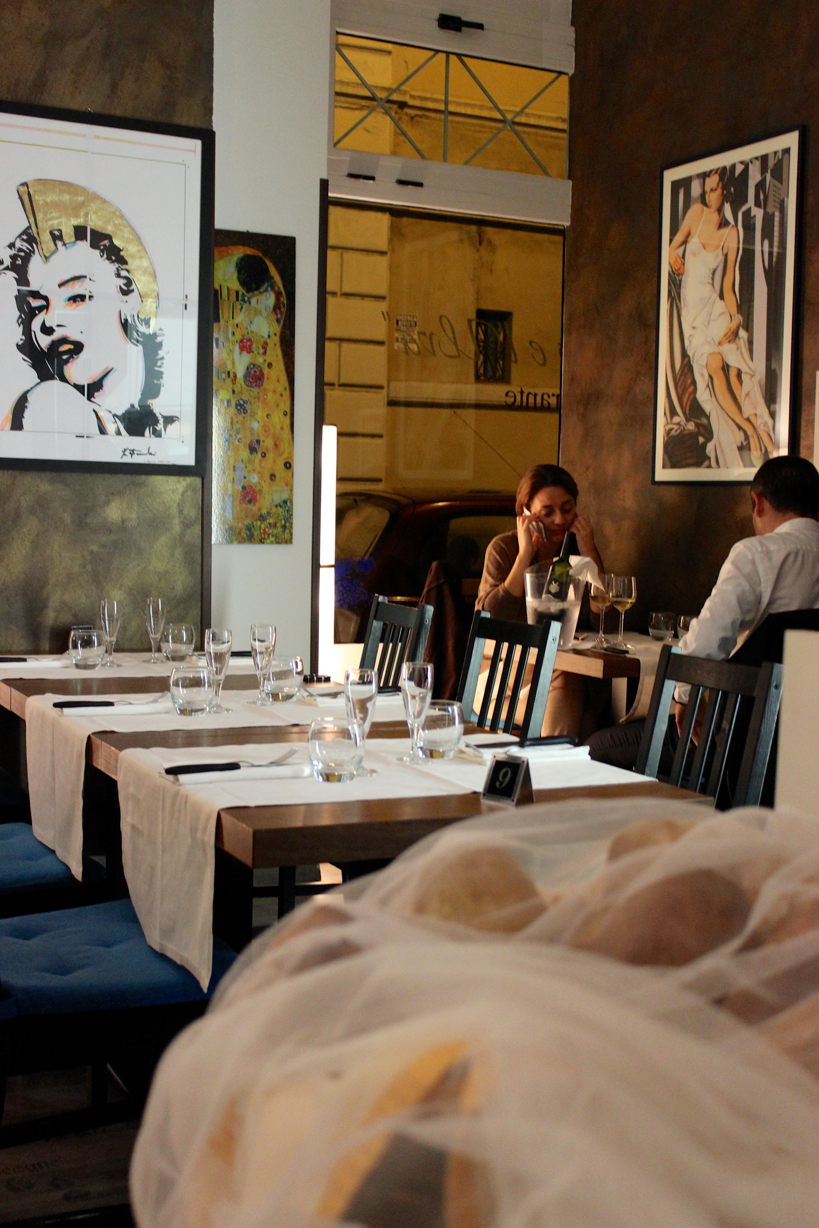 Before the restaurant filled up, I tried to get a few shots of the colorful art and multi-hued walls. (Also the bread resting under that blanket was like dessert: the dark bread is made in house, the other is just as sweet and addictive)