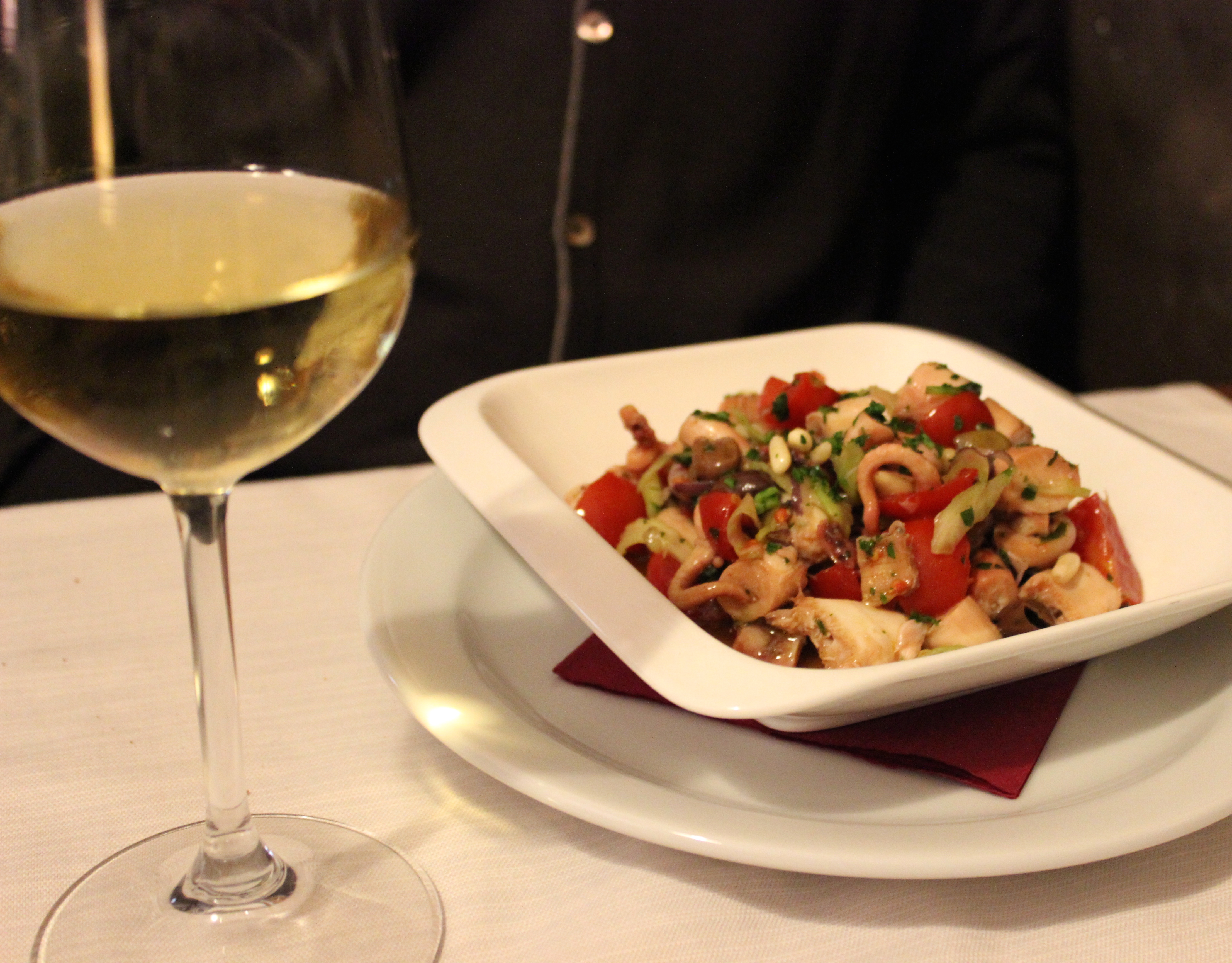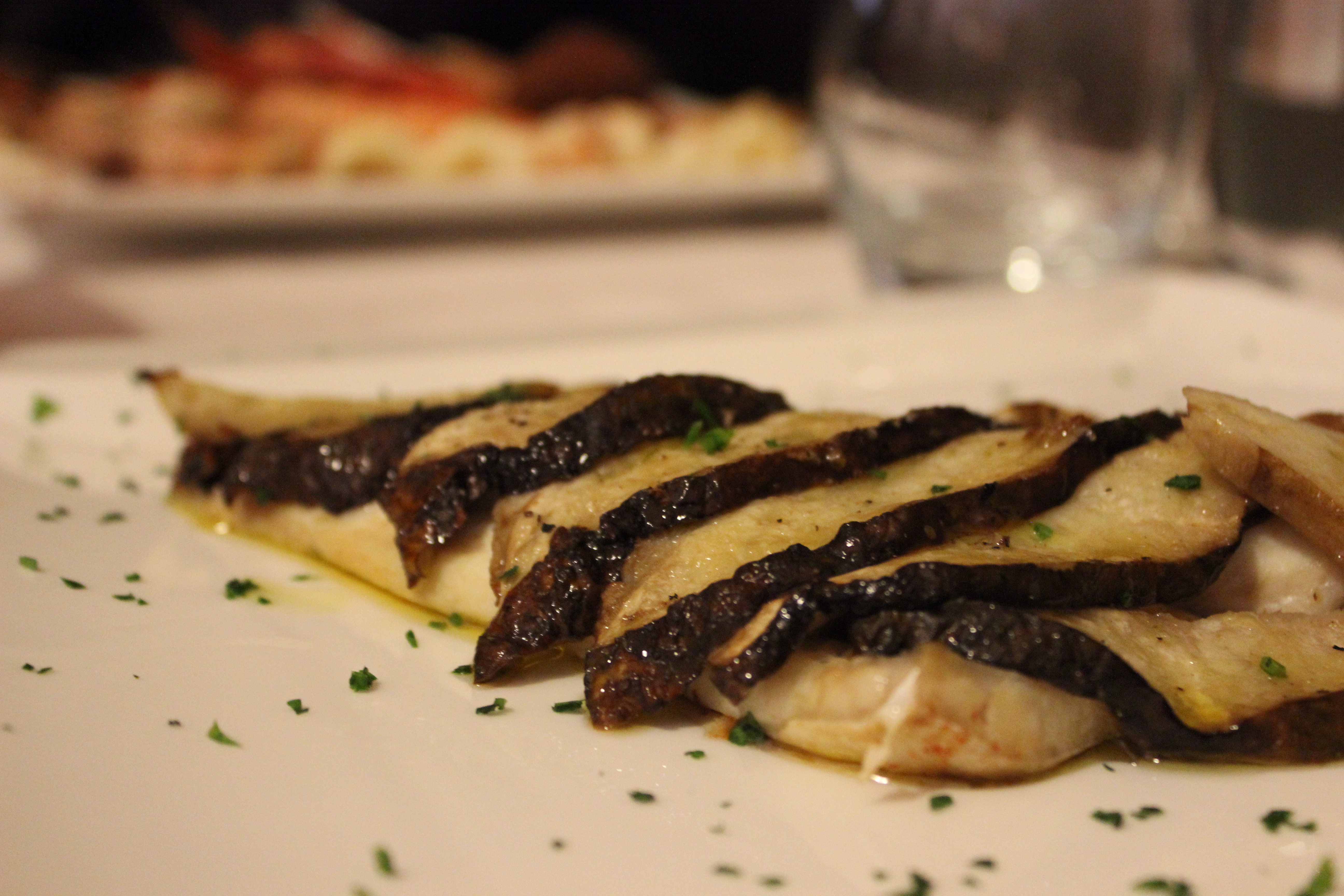The bread rests under a blanket, and when the two varieties arrive at our table, we devour the contents in under five minutes. One variety is baked in-house. It is dark with some kind of subtle herb flavor. It is goldilox consistency: not too hard, not too soft. The other is a white bread which is also warm and just grazing the midpoint between hard and soft; it tastes almost like dessert. Marcello offers us another basket. (I wish he wouldn’t but I don’t object).