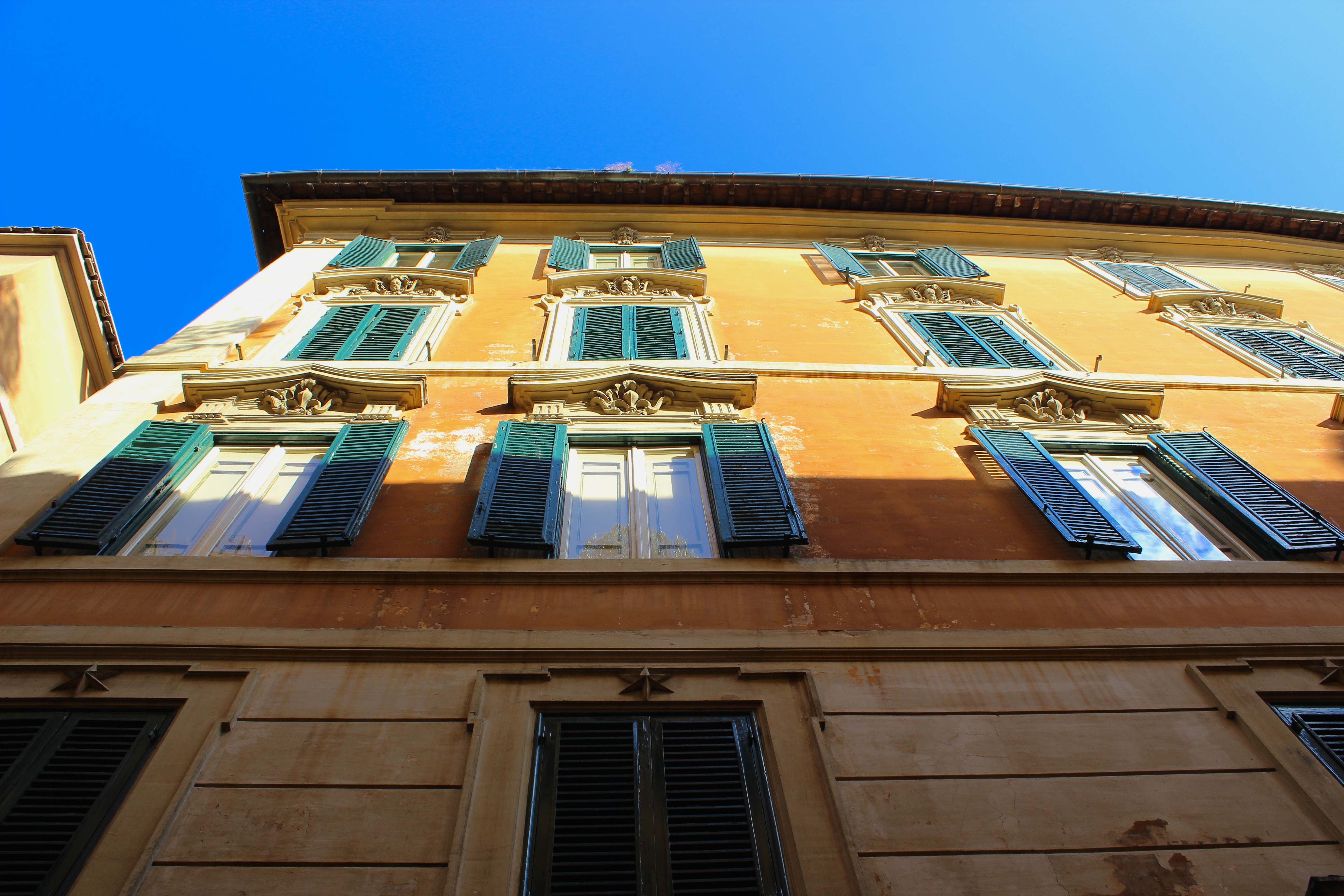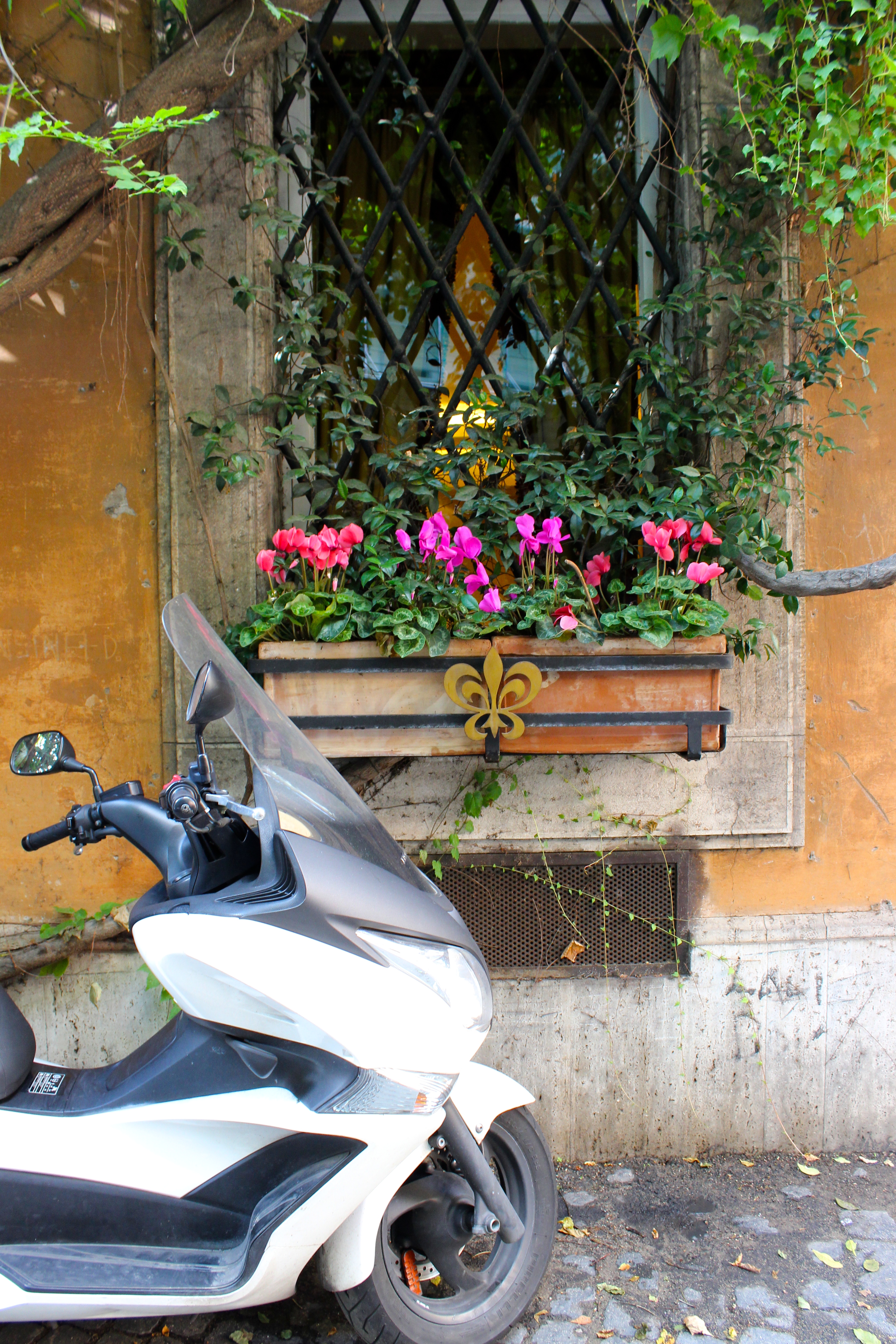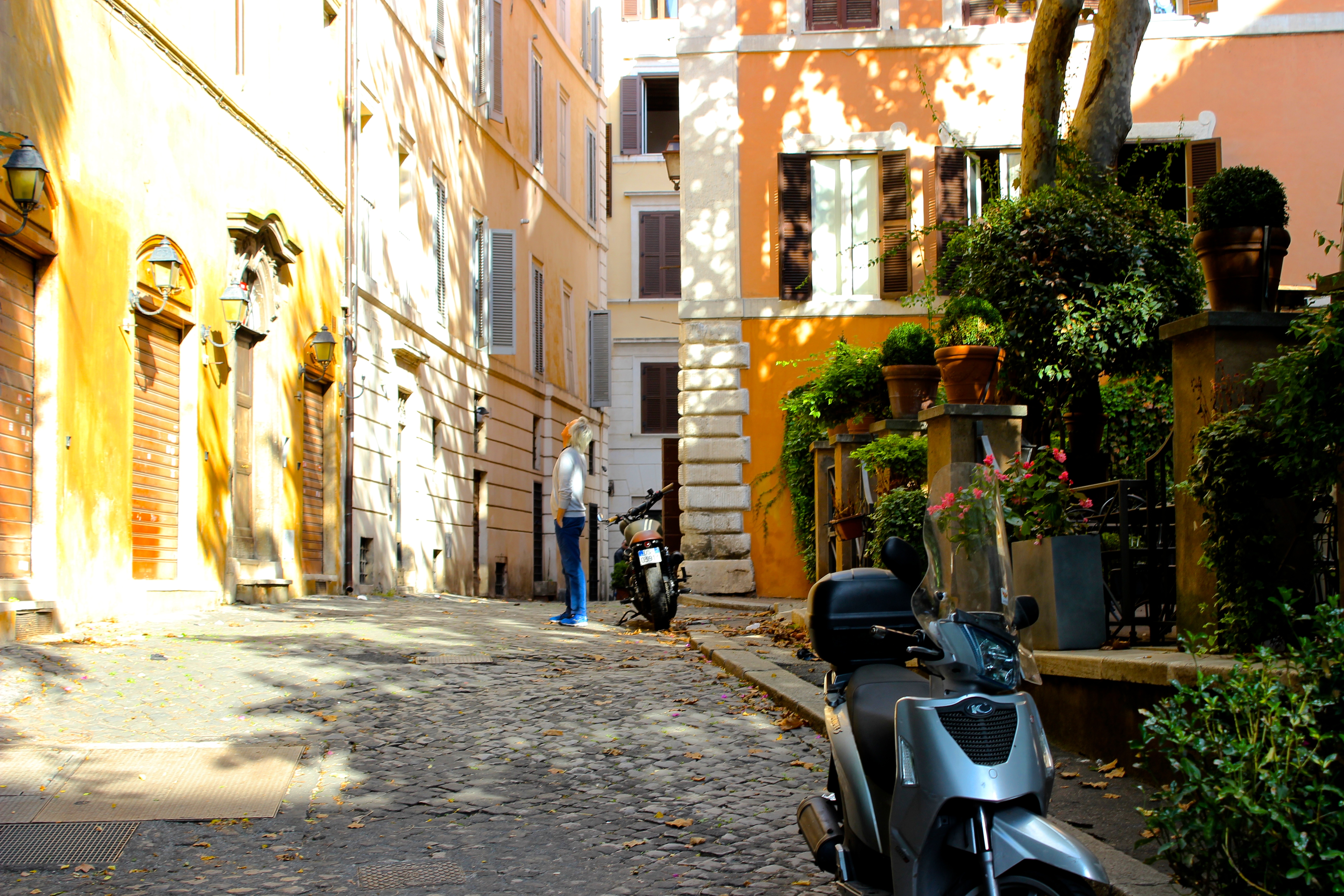One need only to wander the maze-like cobble stoned streets and look up and around in order to appreciate Rome’s outdoor museum quality. The warm, mediterranean colored buildings are medicine for the weary, the bored, and the jaded. The terra-cotta pots perched at the very edge of sixth floor rooftops and terraces are displays of ‘come no?’ Vine-covered homes and hotels, intricate arched doorways and painted shutters- shutters everywhere. Narrow, winding lanes lined with scooters and caffe tables, Romans in full designer garb, wardrobes stylishly speaking out loud with reds and blues and greens. Roma is a technicolor city filled with gregarious people driven by technicolor emotions; a physical place that cannot help its own power and affectation.