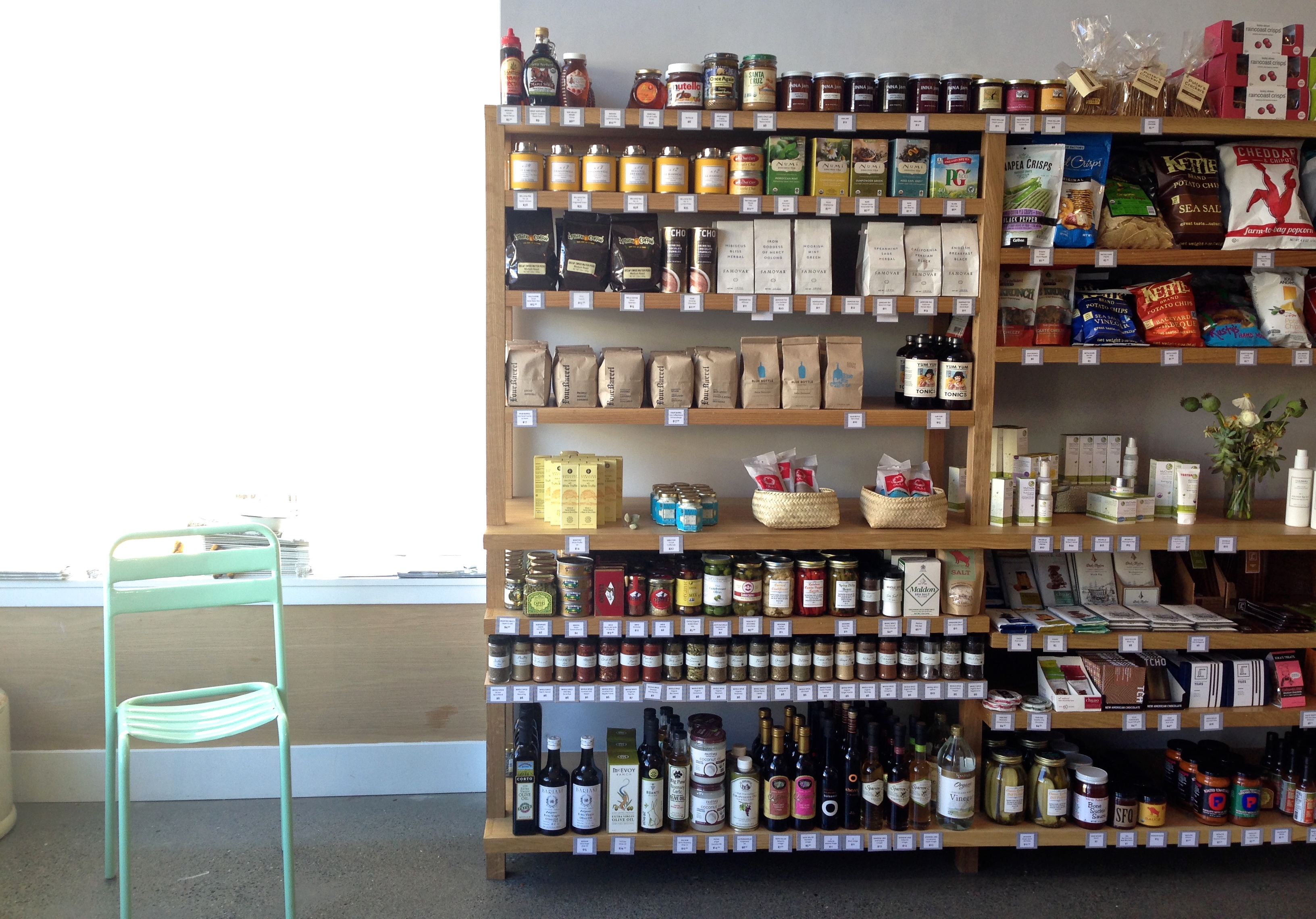 As if Noe Valley weren’t pocket-size enough, a whole other piece of the neighborhood is hiding six blocks farther south. It is as if the San Francisco wind scattered them down to 30th, and the only worthwhile snippet between 24th and La Ciccia is the new Bom Dia Market. It is indeed exactly what it professes to be: a neighborhood corner market selling just a little bit of everything and an impressive collection of wine. I found my favorite cranberry walnut date bites made by Bacano Bakery, and I indulged in everyone’s favorite Goody Goodie chocolate chip cookie with chocolate wafers in the middle. It was divine, but rich, and I’m glad it’s all the way in far-flung Noe Valley and not in my own neighborhood. They have ready-made food items, an assortment of condiments, all of my favorite coffee brewers, organic cleaning products, and an adorable, petite produce display.