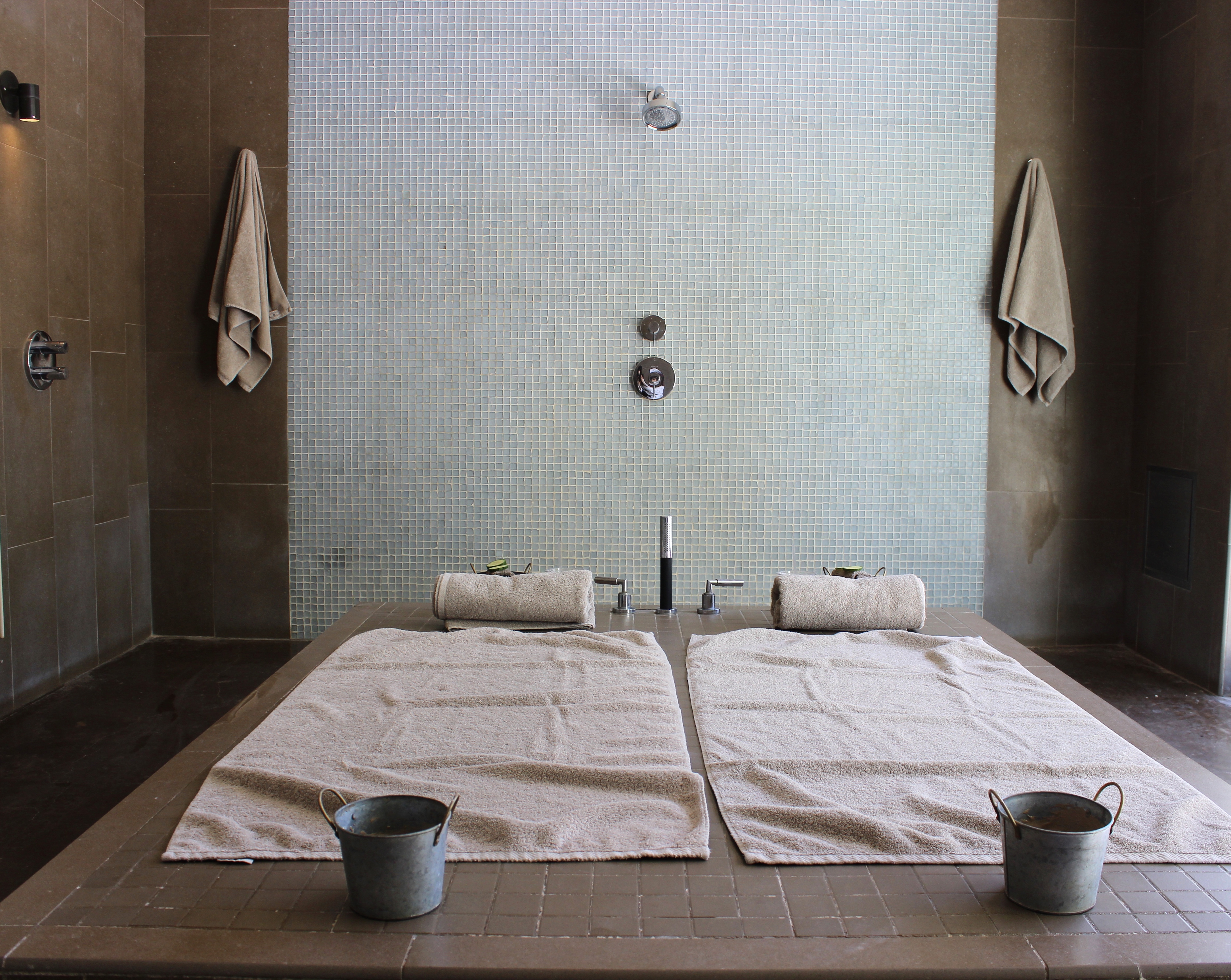 We were in luxurious terry robes within ten minutes of arriving at Solage, just a few minutes from the village. The locker room is large, glossy white, and feels brand new. Directly outside of the locker rooms are his and hers open-air lounges, also dressed in white, with modern seating and endless natural light. I would have been quite content to spend the day in this open space, one palm tree overhead, magazine and ice water in hand.