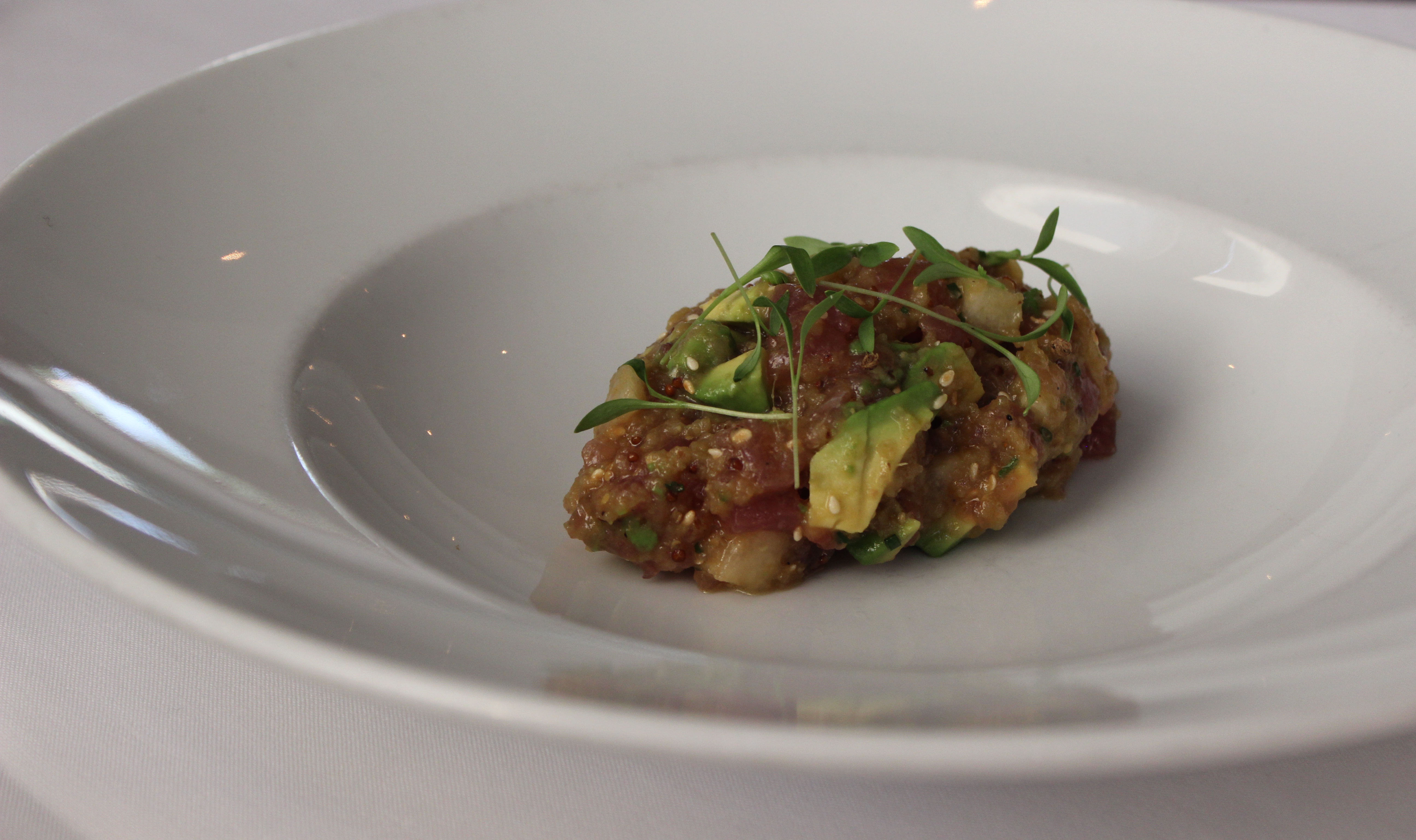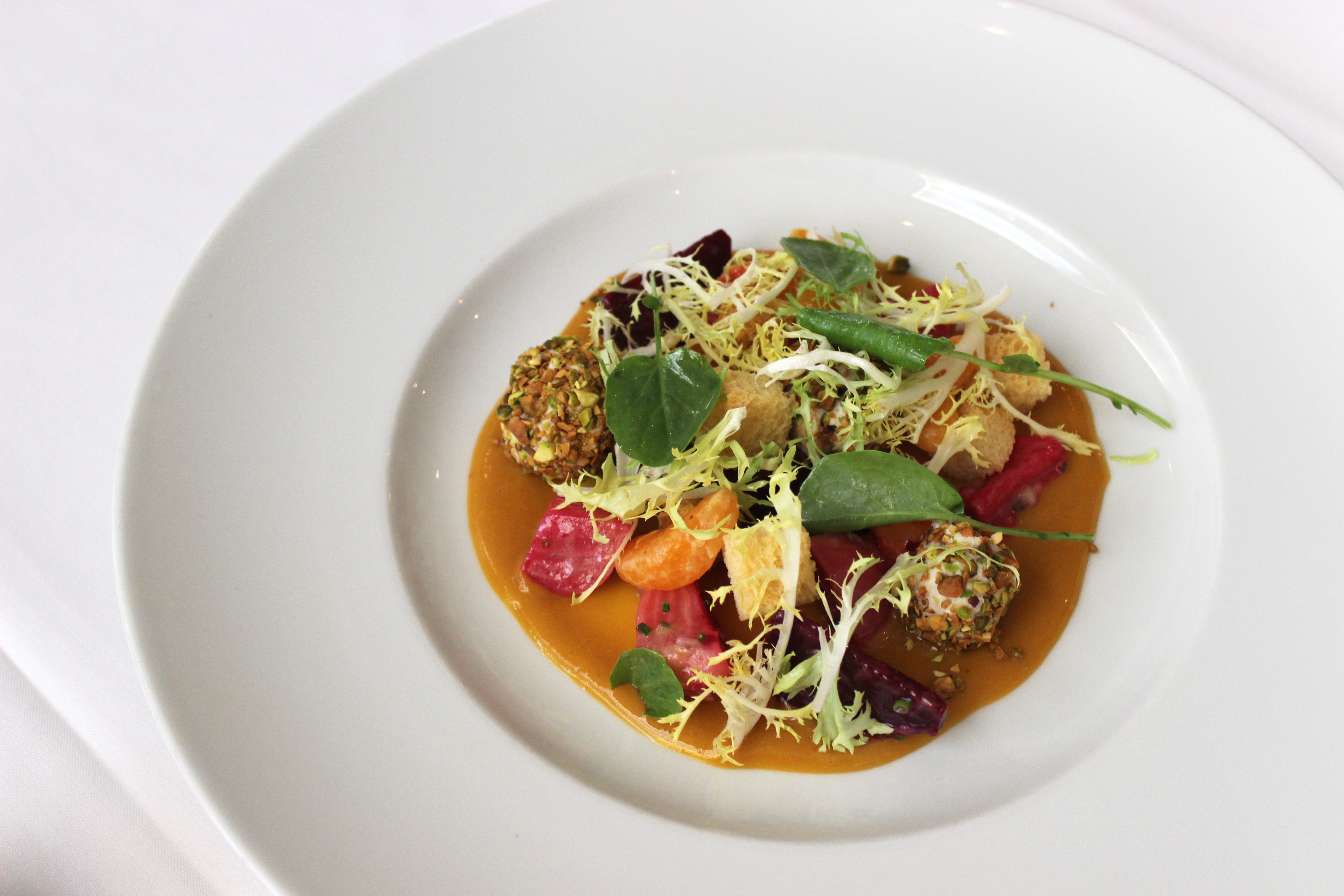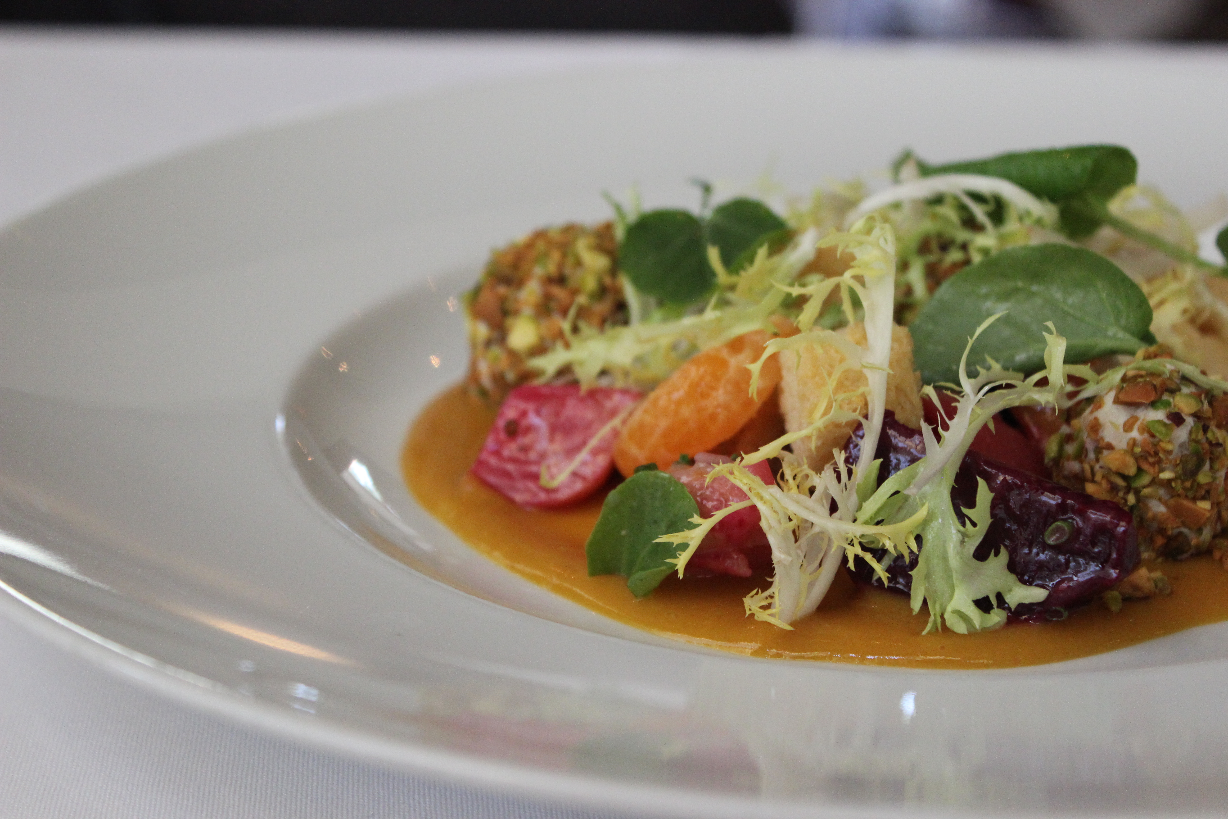 Redd was the winner for our Monday evening dinner. Sticking to the spa-day theme, we ordered the yellowfin tuna tartare with avocado, cilantro, and chili oil; it is beautifully presented in an oval shape and most definitely had a chili kick to it. The beet salad was exquisitely plated. An orange reduction with orange licquor made up the base, and round trout rillettes rolled in pistachios were divine. Next we had the skate wing with perfectly cooked spring asparagus, and finally, to celebrate a birthday a few days ahead of time, we opted for the newly added orange cake with strawberries, rhubarb, and strawberry sorbet. It was a lovely light dessert.